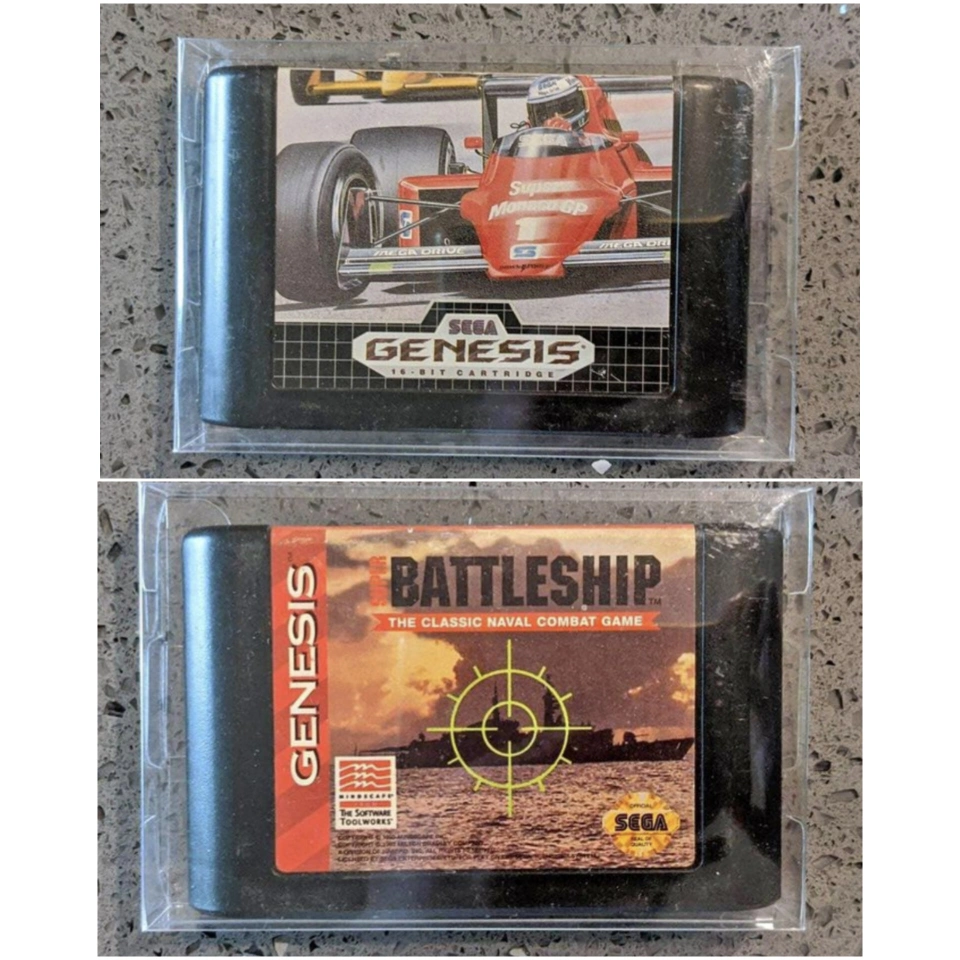 Buy individually ($15/$10) or both for discount ($20) Battleship Sega Genesis $15 "The game features two modes: Super Battleship mode and Classic Battleship mode. Classic Battleship mode is essentially an electronic version of the board game Battleship, where the players play against the computer because the game is strictly single-player. Super Battleship is a naval simulator played by sailing ships to a close enough range to shoot an opponent's ships and cities. Super Battleship contains 16 missions that must be completed within a certain number of rounds. Ships have four different weapons: missiles, torpedoes, depth charges, and guns. The game is turn-based with each side giving movement and attack orders within a time limit. A turn ends when either the time limit expires or all ships receive orders. Actual combat occurs in real-time: guns and torpedoes are fired at surface ships while the opponent can fire back. Depth charges are dropped on submerged submarines. Cruise missiles move erratically and must be guided to the target. Crewmen can be assigned to repair ships' damaged systems. Ships resupply by capturing bases and storehouses or pulling into friendly harbors. In some missions, once the player, the enemy, and the neutral merchant ships have taken their turns, friendly or enemy shore batteries will then attack any ships that are within range of their fire support. The game's interface contains both radar and sonar modes. Radar detects surface ships while sonar detects submarines and mines. Victory conditions vary from escorting freighters to a destination or completely destroying an enemy force. Aside from the battles taking place in real-time, Super Battleship is essentially a strategy game with a relatively slow pace. It also provides no background and very little storyline. The four ships are the same as those in Classic Battleship (PT Boat, Cruiser, Destroyer, Battleship) but only the enemy gets to use submarines." Super Monaco Grand Prix $10 "The original concept for Super Monaco GP came from Hisao Oguchi, who was at the time a game planner with Sega. The arcade game contained parodies of actual brands that were sponsors in Formula One, which led to a lawsuit from Philip Morris over advertising of tobacco products. Shortly after the arcade game launch, Super Monaco GP was ported to Sega's video game consoles, the Genesis, Game Gear, and Master System. British developer U.S. Gold published ports for home computers. The arcade game was a major worldwide hit; in Japan, it was the third highest-grossing arcade game of 1989 and then the highest-grossing dedicated arcade game of 1990. The arcade and Genesis versions received positive reviews from critics, focused on the game's graphics and playability. Ports for 8-bit systems ranged from mixed to generally favorable depending on the platforms, with the conversions less well received for their difficulty and differences in gameplay." Video Games come with Plastic Protective Sleeves