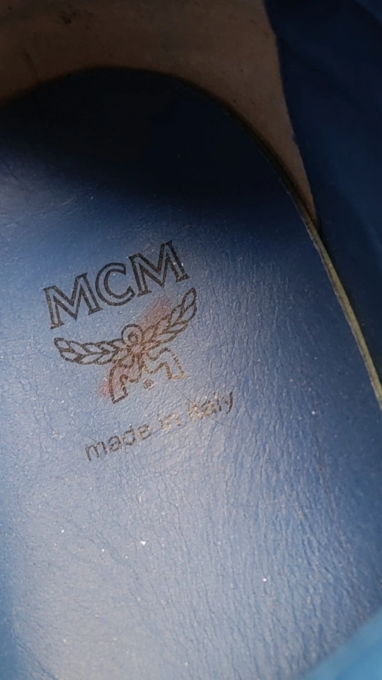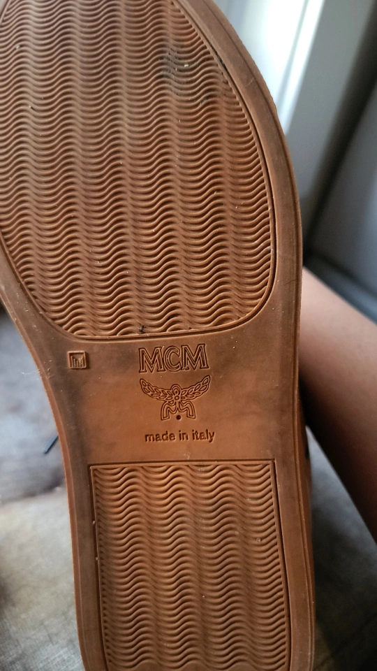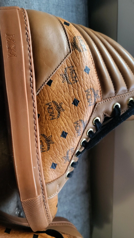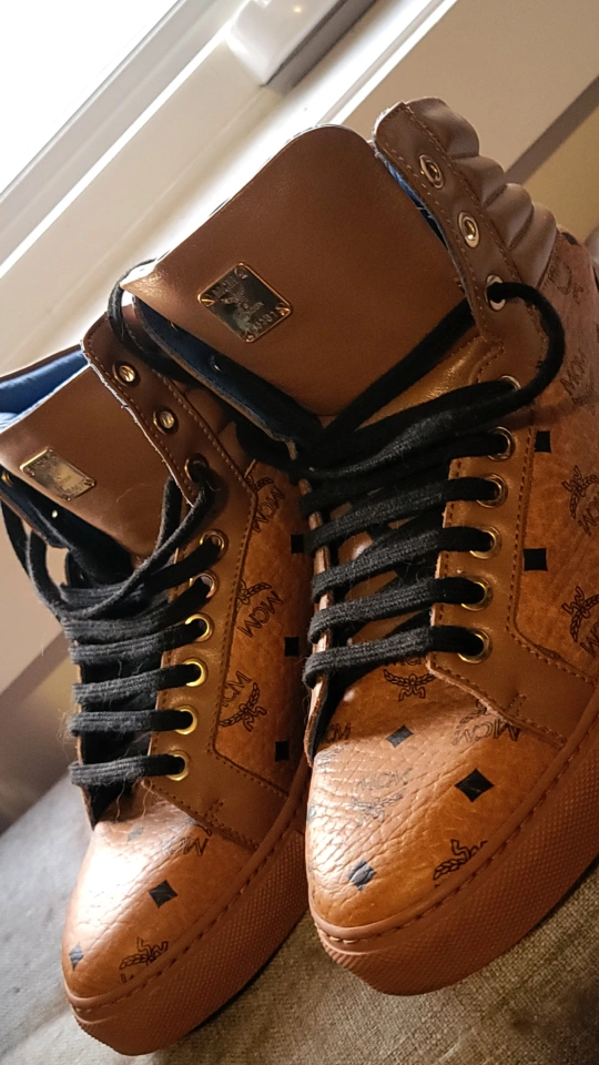 ***AUTHENTIC*** cognac brown viseto leather high top sneakers. MCM logo throughout. Made in Italy. Black laces. In mint condition!!