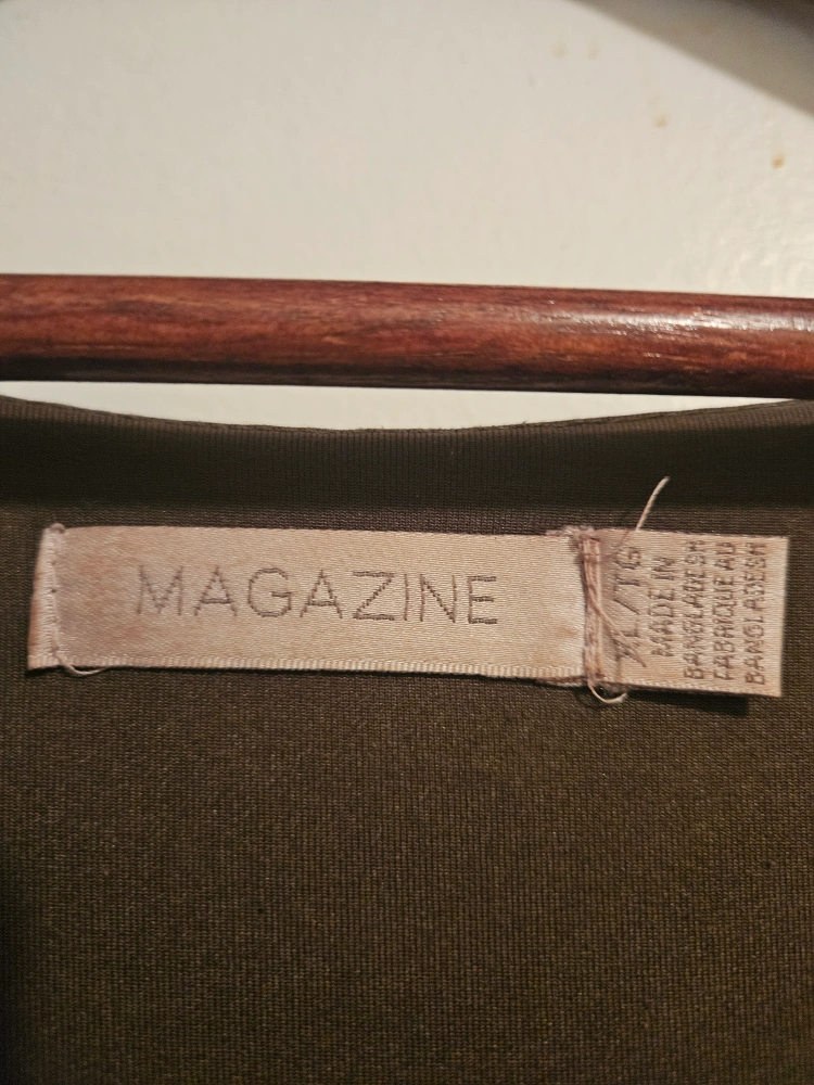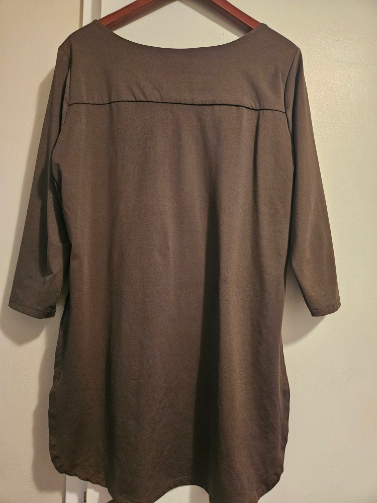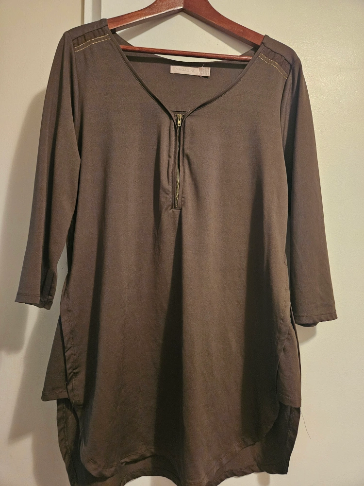 Dark brown, 3/4 sleeve blouse. Features a zipper neckline and asymmetrical hem.