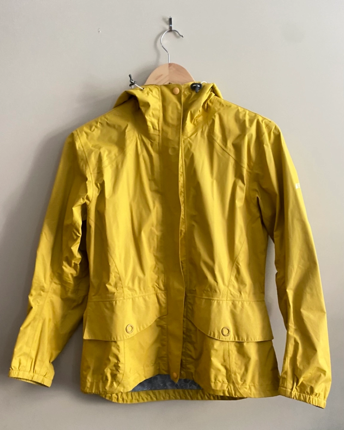 Women's yellow rain jacket. Features a hood and pockets. Good for outdoor activities. Size: S