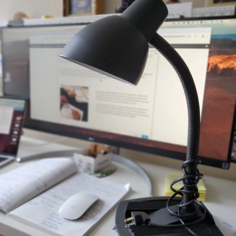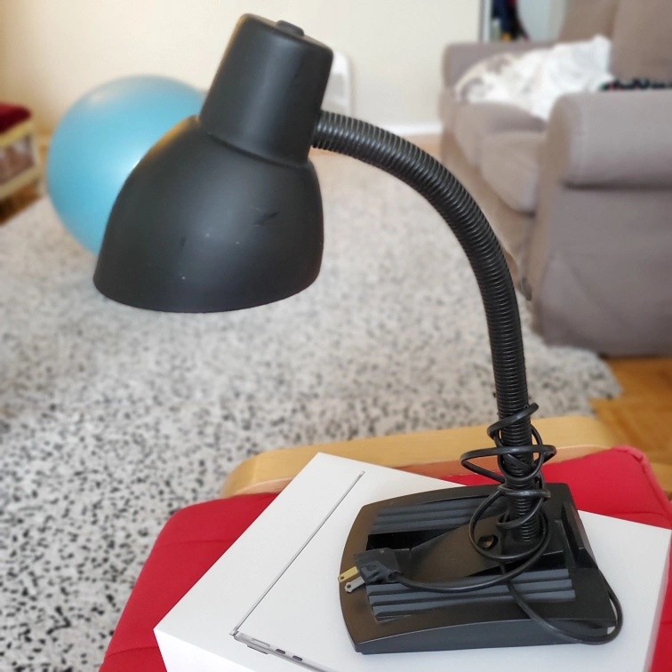 Functional desk lamp. Black finish. Flexible gooseneck. Clamp base. Maximum 60W bulb. Height 16 inches. Available for pick-up at Bayview Village