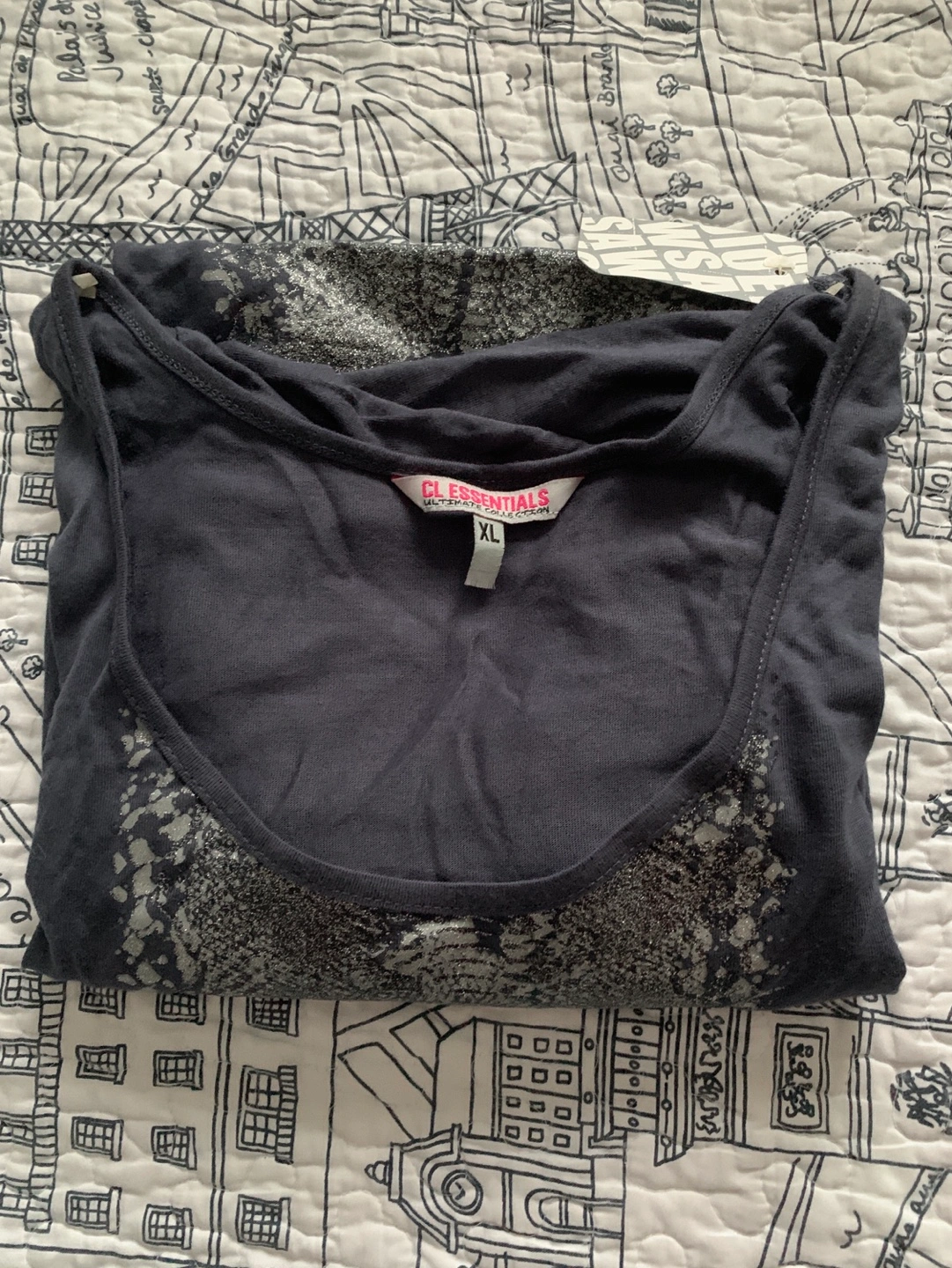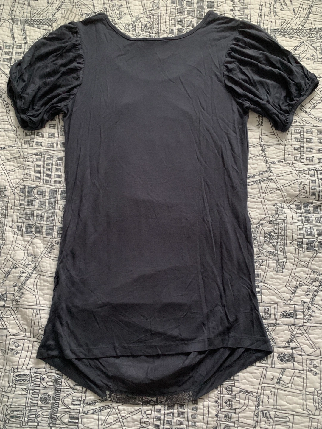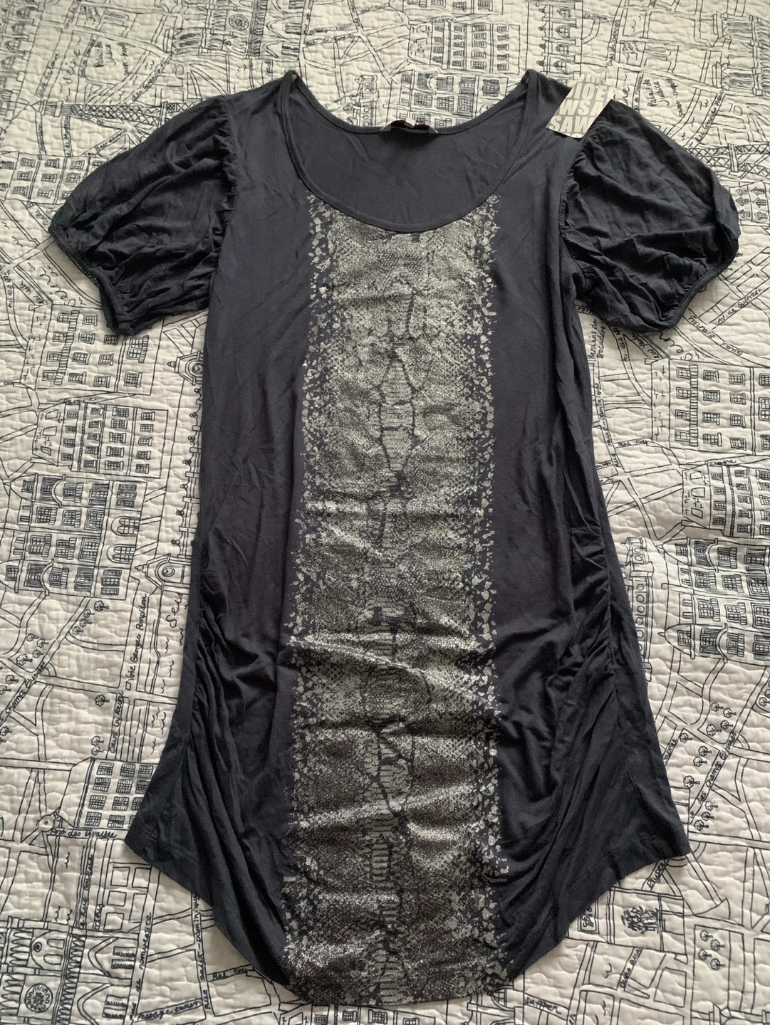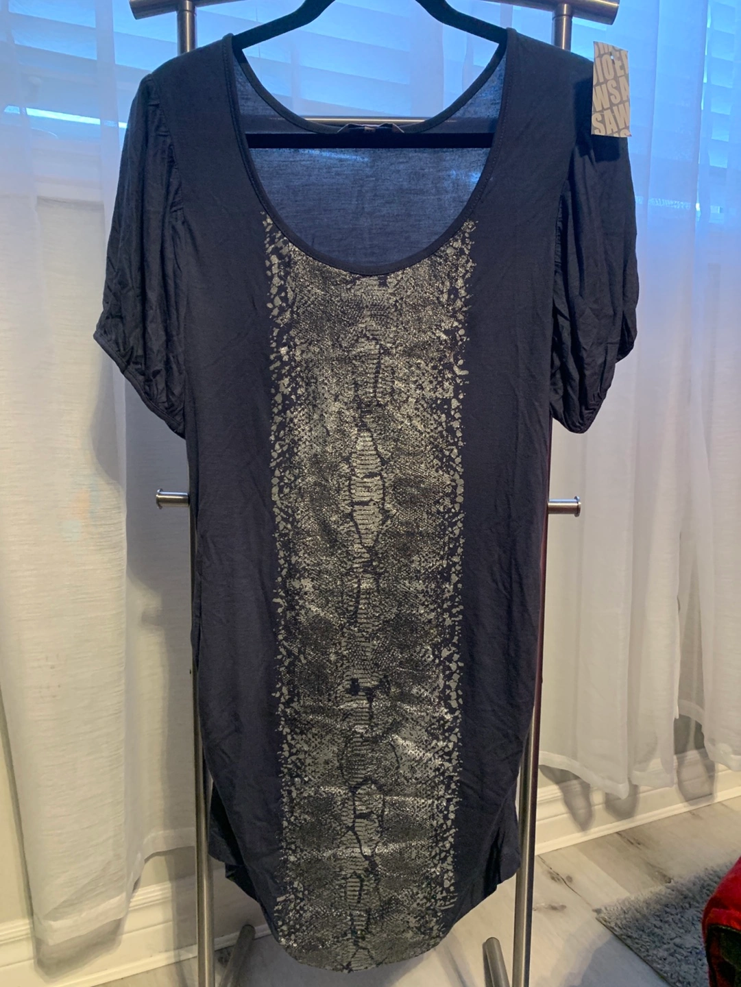 Dark grey tunic top. Size XL. Features a snakeskin print down the center. Short puff sleeves. Scoop neckline. Relaxed fit. Slightly longer in the front.
