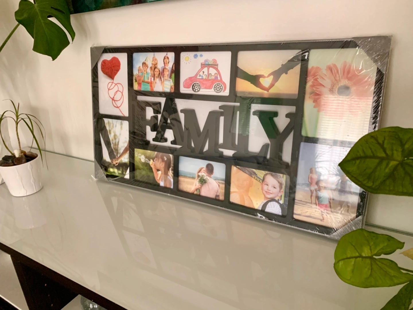 12 opening collage frame. Features the word FAMILY. Black frame. New in plastic packaging.