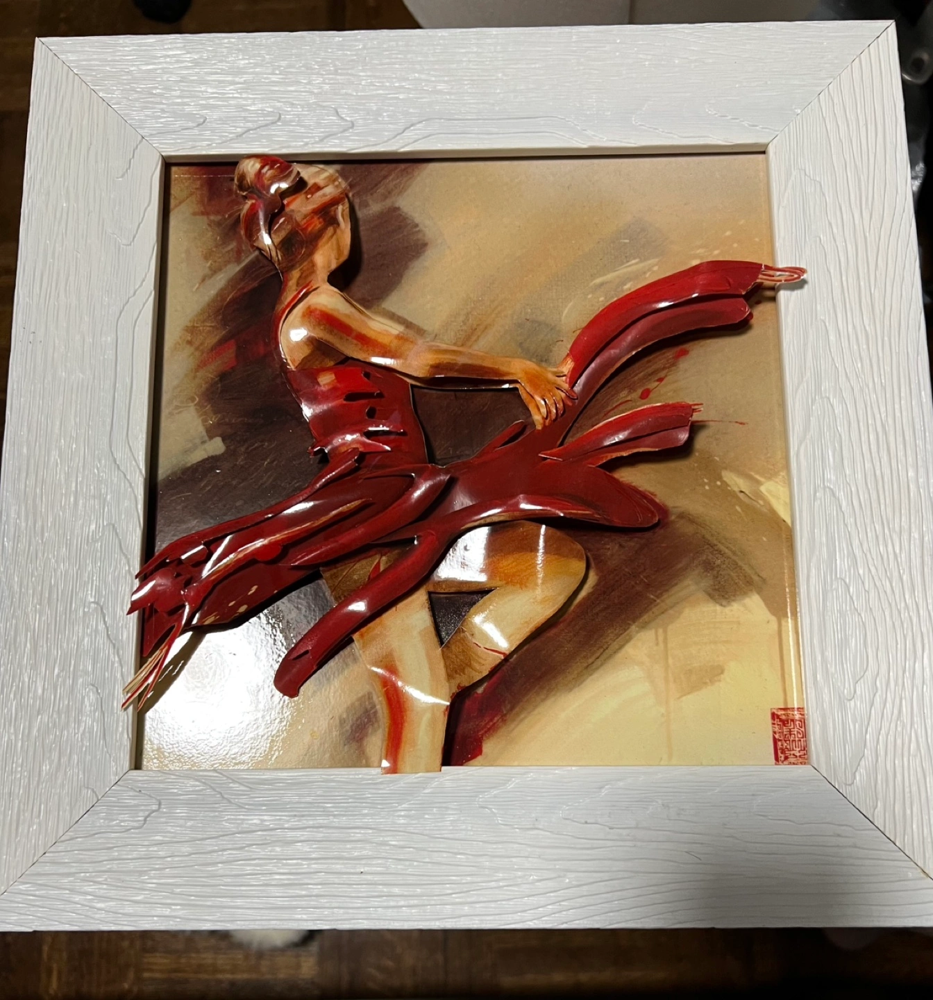 Unique framed artwork. Features a ballerina in a red dress. White frame. Ready to hang.