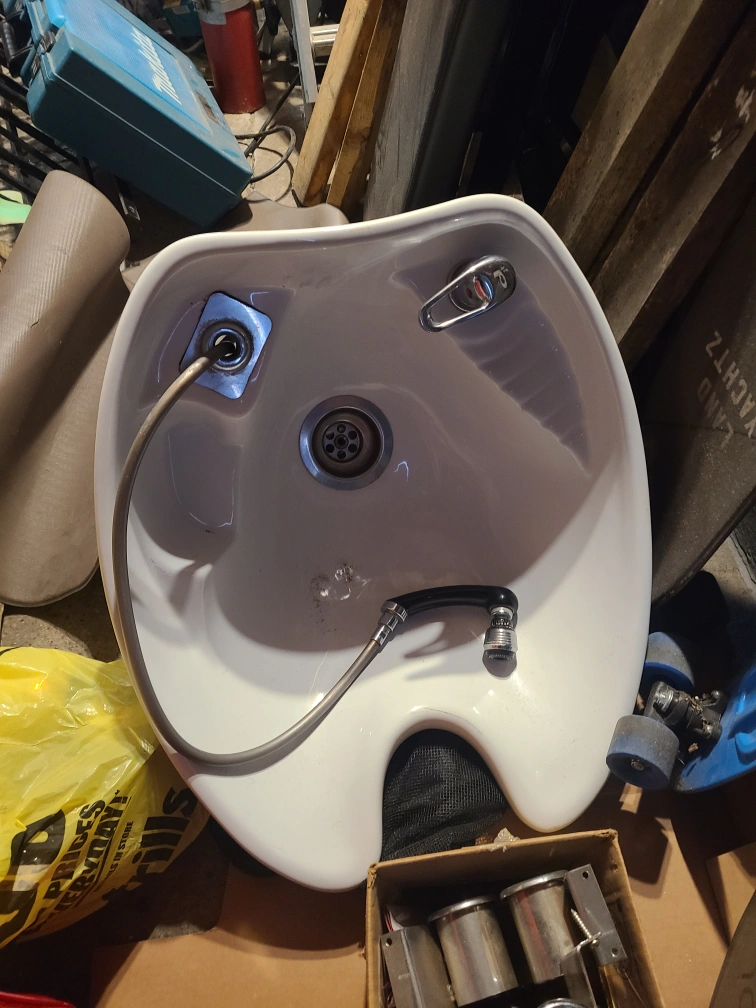 White ceramic shampoo bowl. Includes spray nozzle and faucet. Pre-owned, but in fantastic condition. Make an offer!!! NEED TO GO ASAP. No chips or cracks.