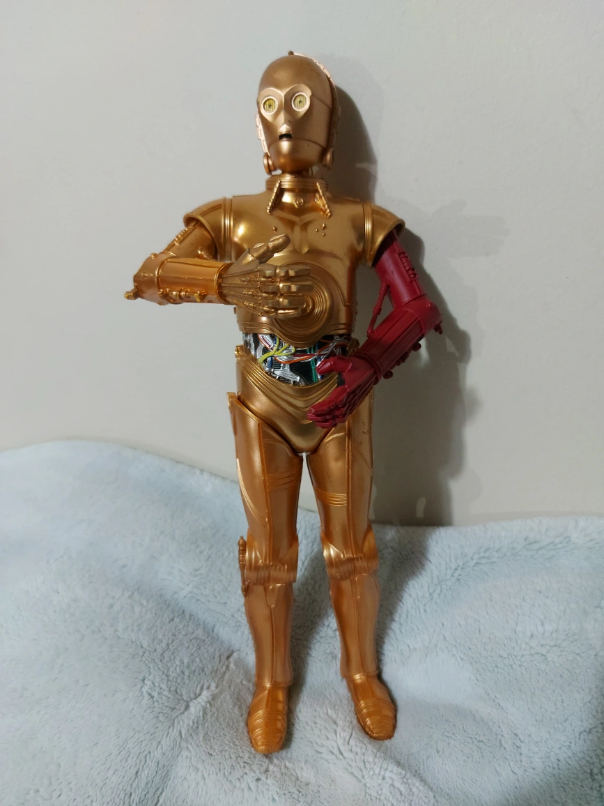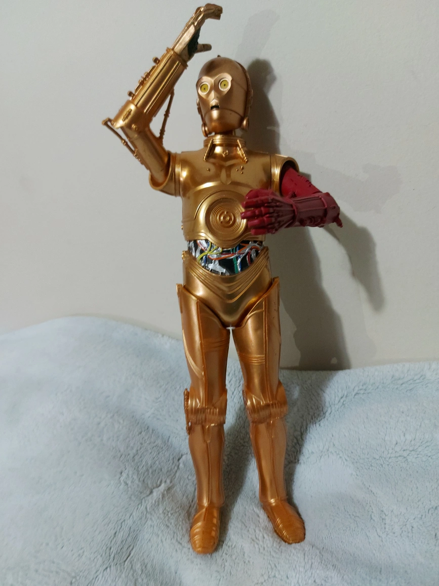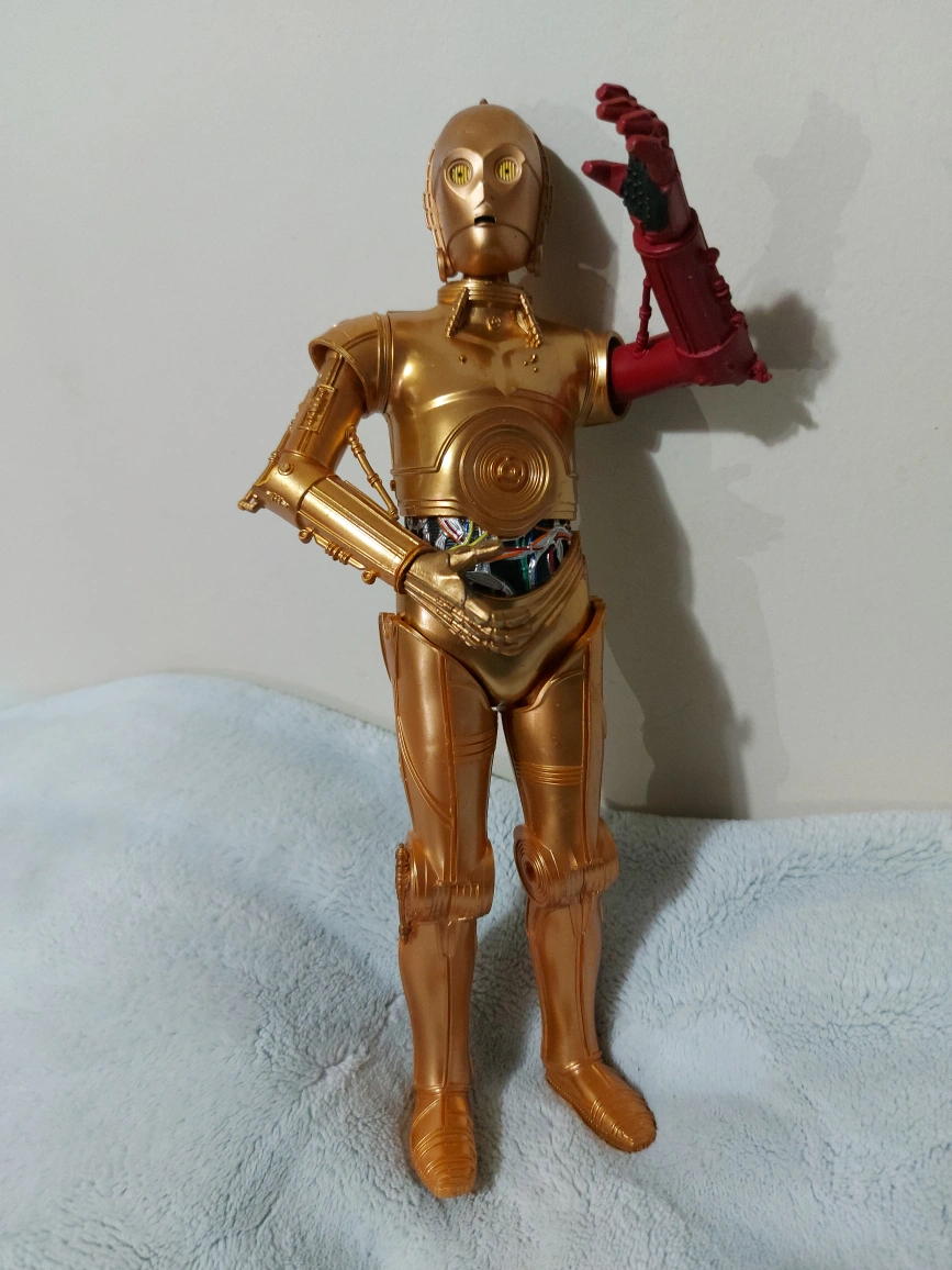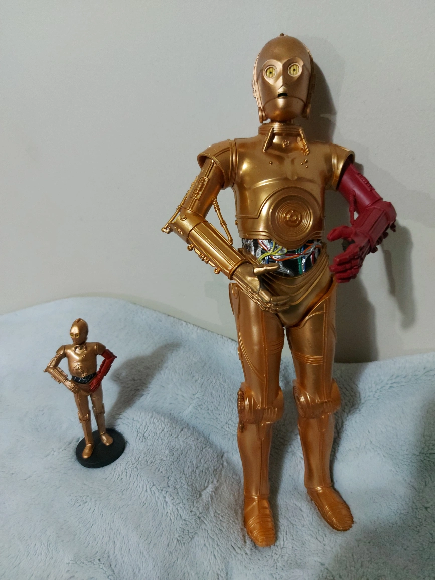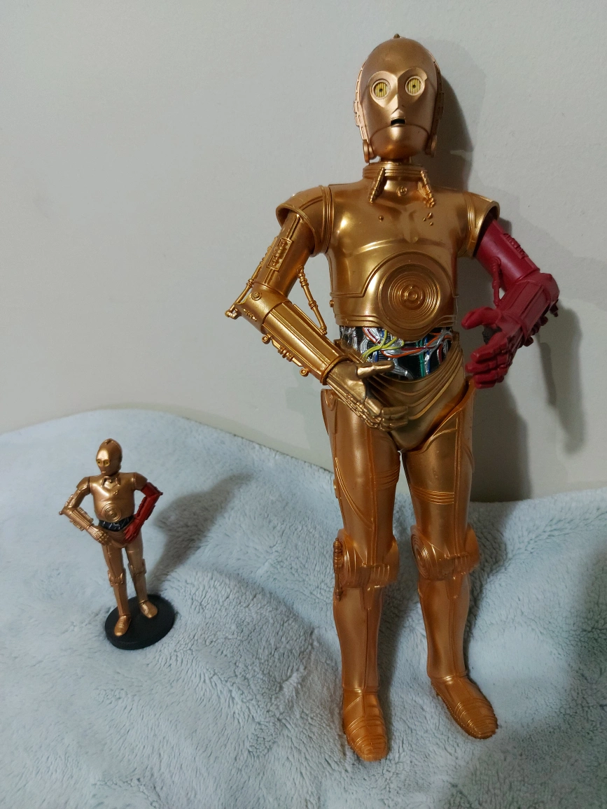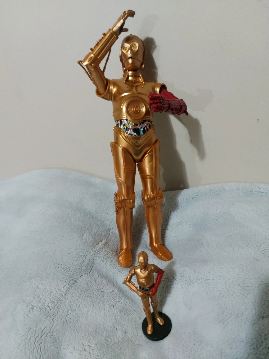 Two Star Wars figures, one large C-3PO and one smaller. Gold coloured. One arm is red on each figure. Collectible.
