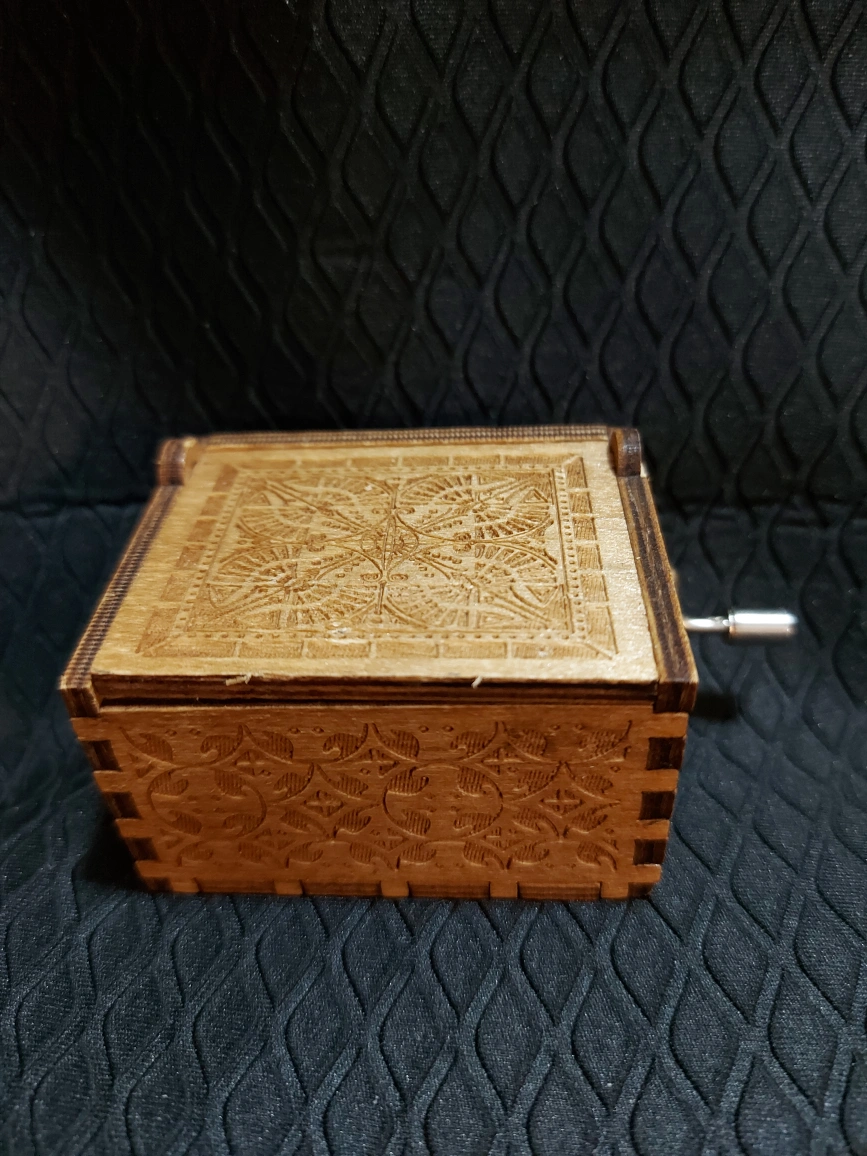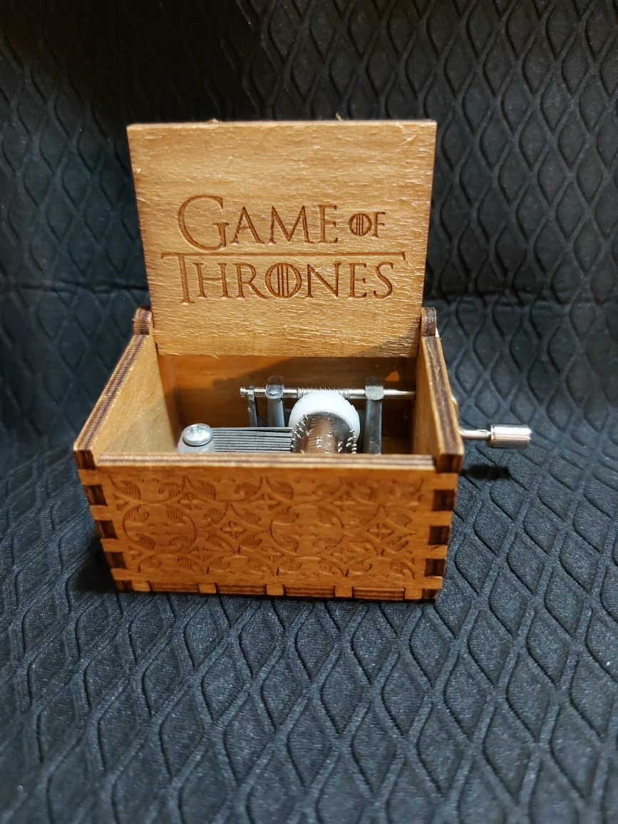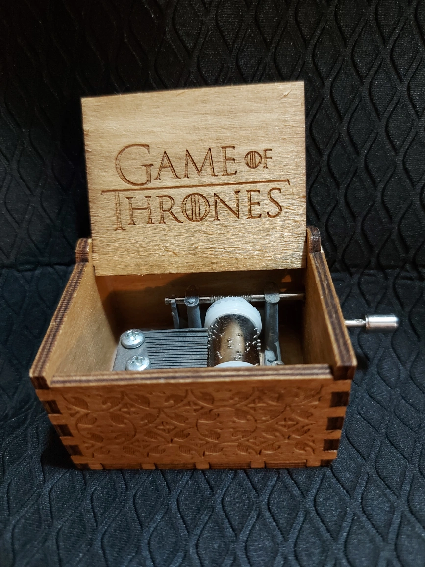 Hand-cranked music box. Intricate wood carvings. Game of Thrones logo on the lid. Plays a tune.