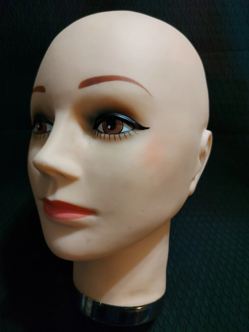 Plastic mannequin head. Features painted eyebrows, eyes, and lips. Mounted on a dark stand.
