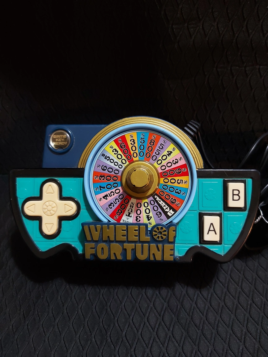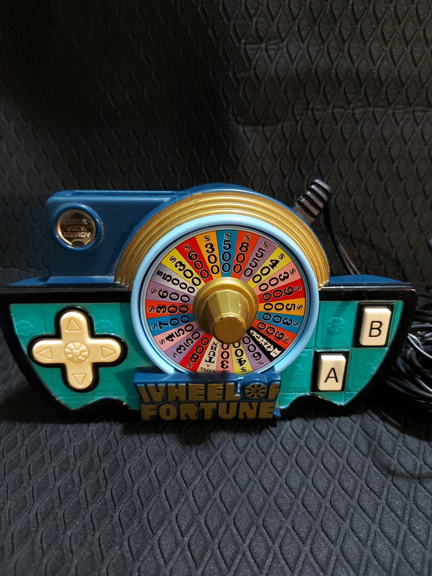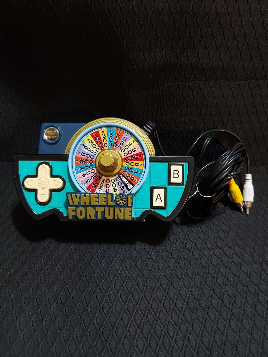 Vintage Wheel of Fortune game. Features a spinning wheel and controller. Connects to TV via AV cable. Great for collectors.