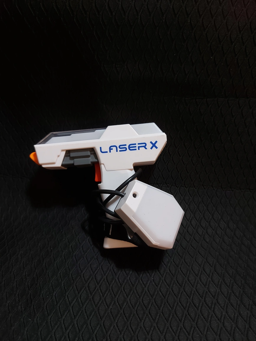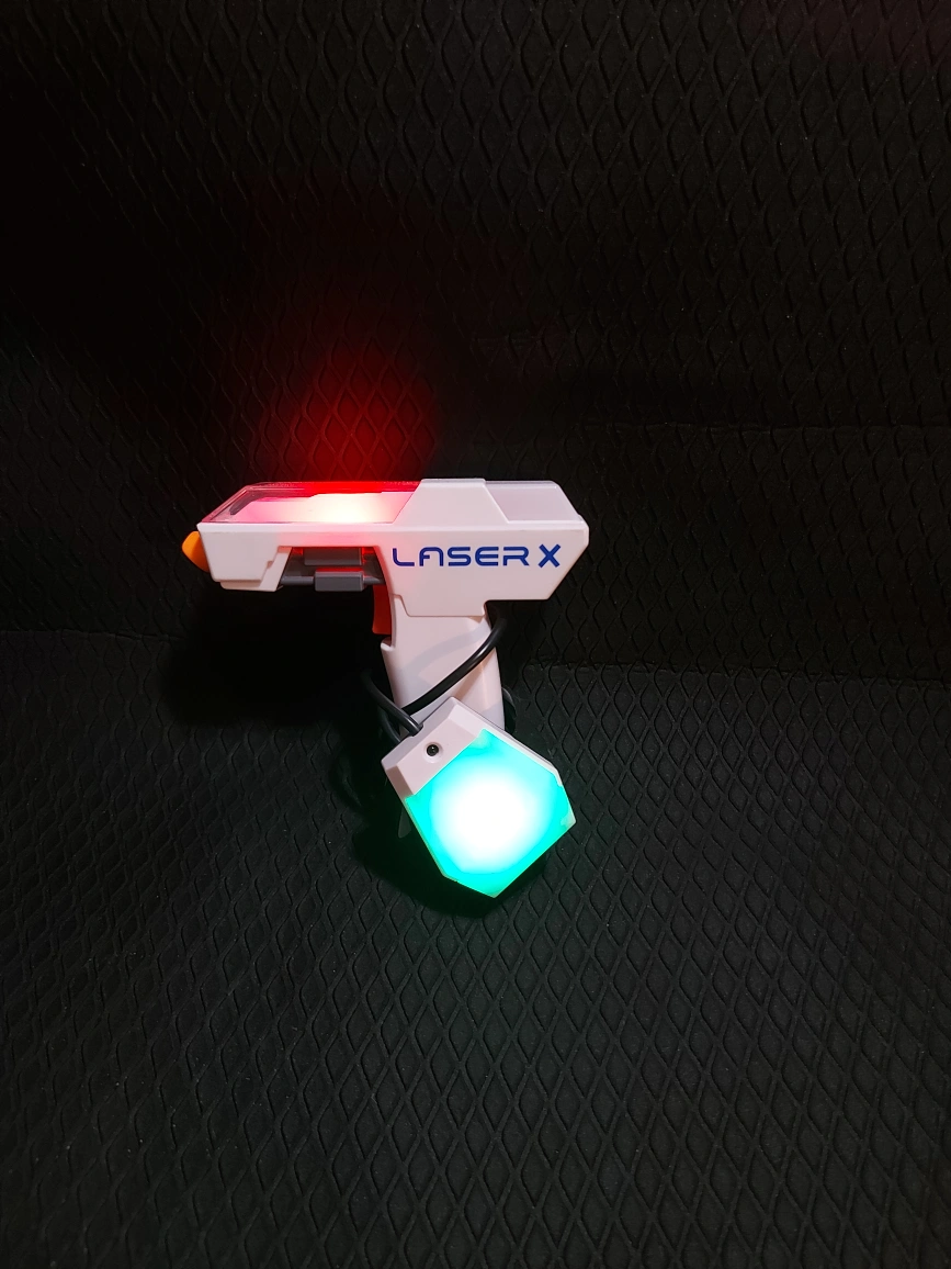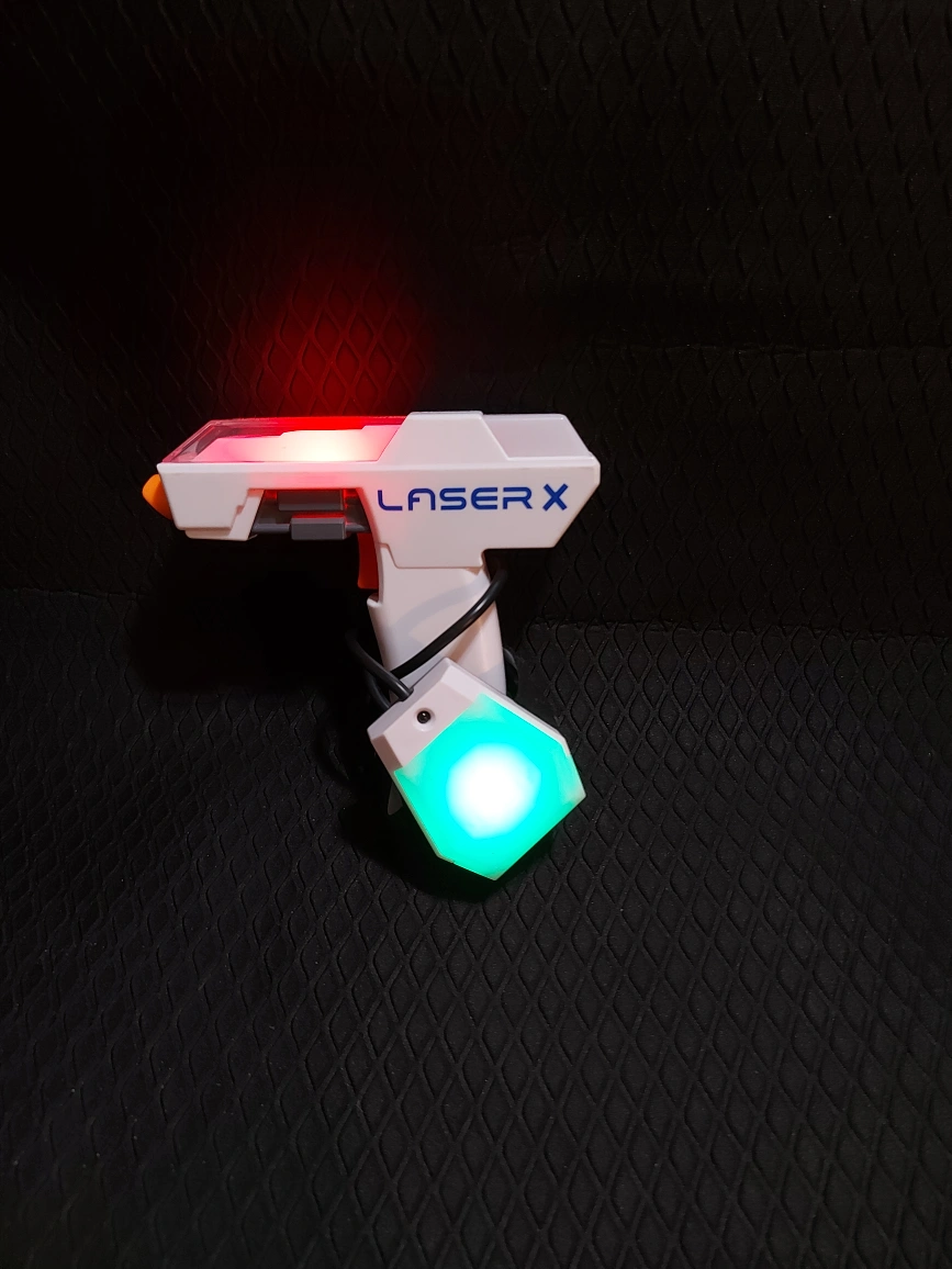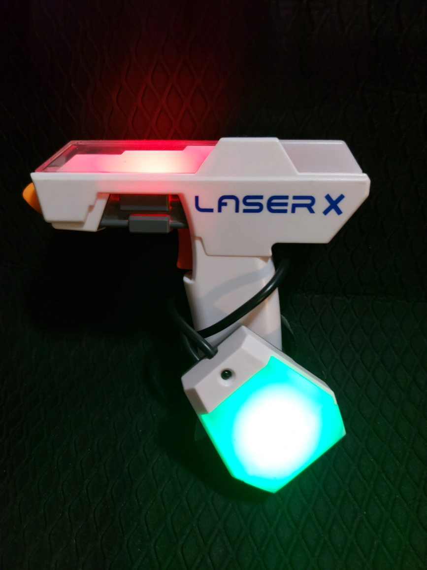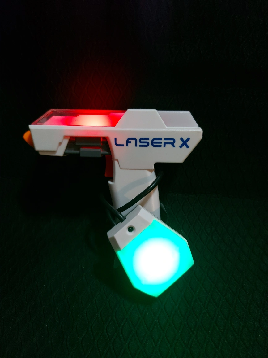 Laser X blaster and receiver. Lights up. Great for indoor and outdoor play. Fun for all ages.