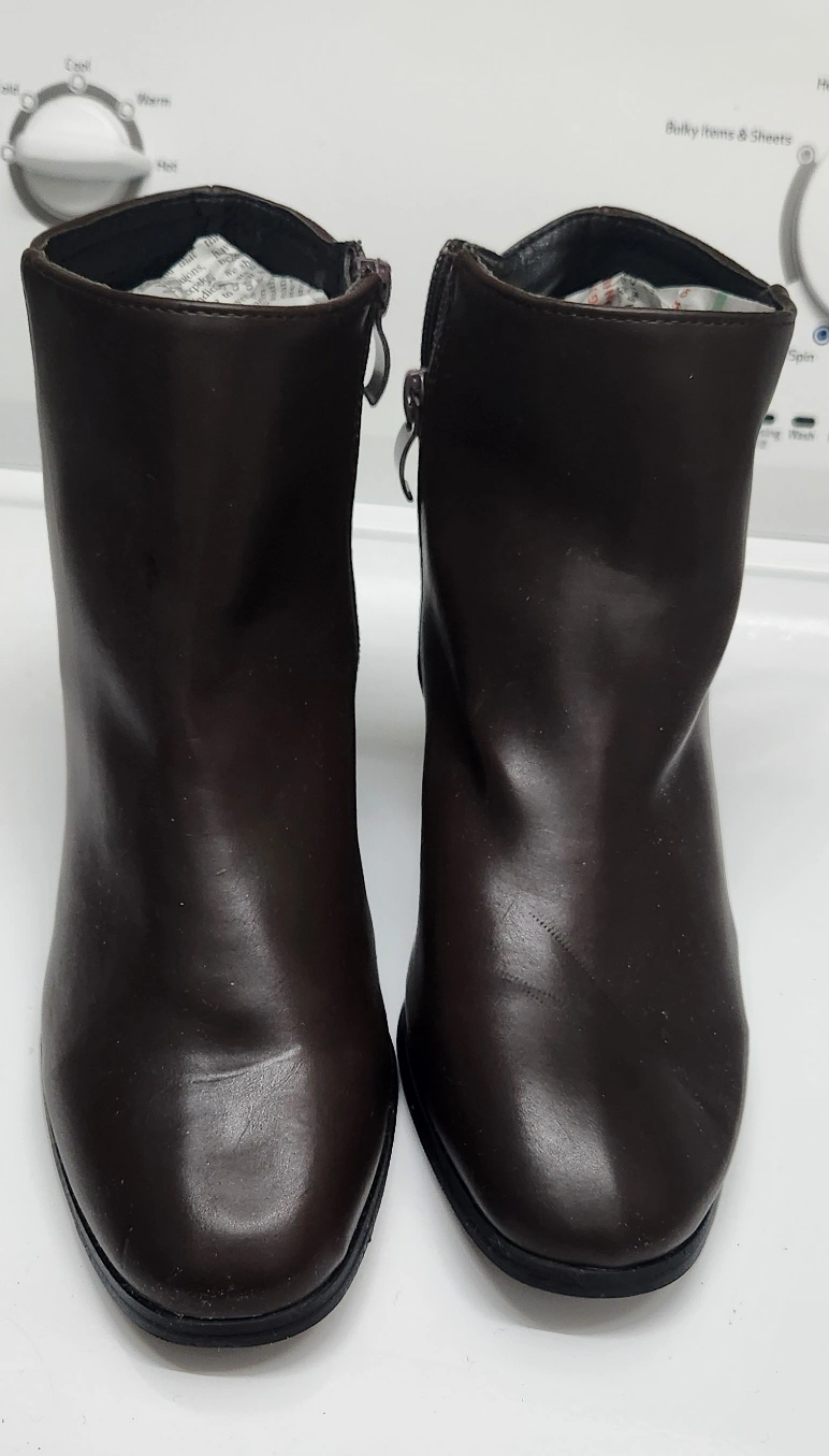 Brown faux leather ankle boots. Side zipper closure. Low block heel. Size 8. Made in China.