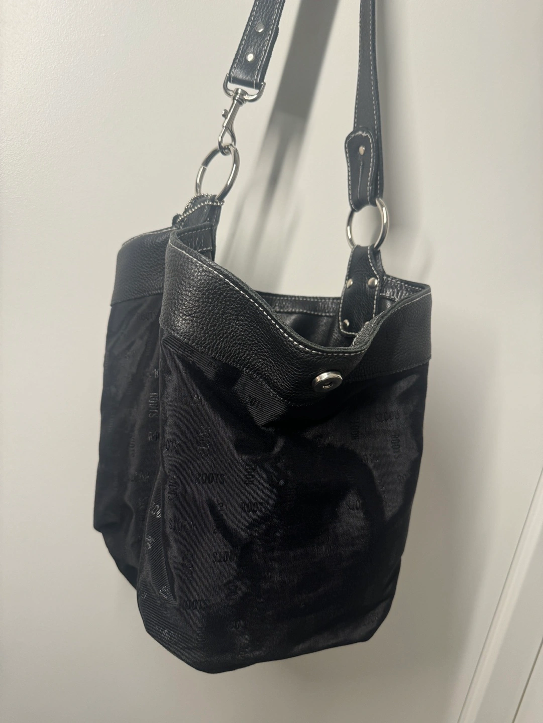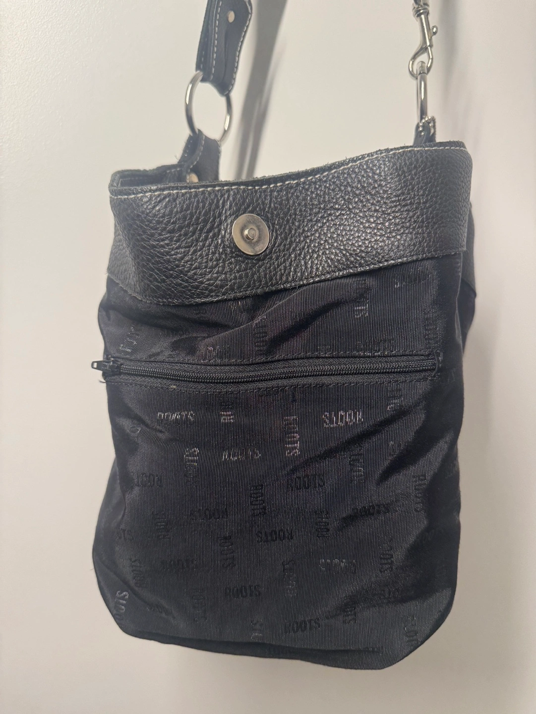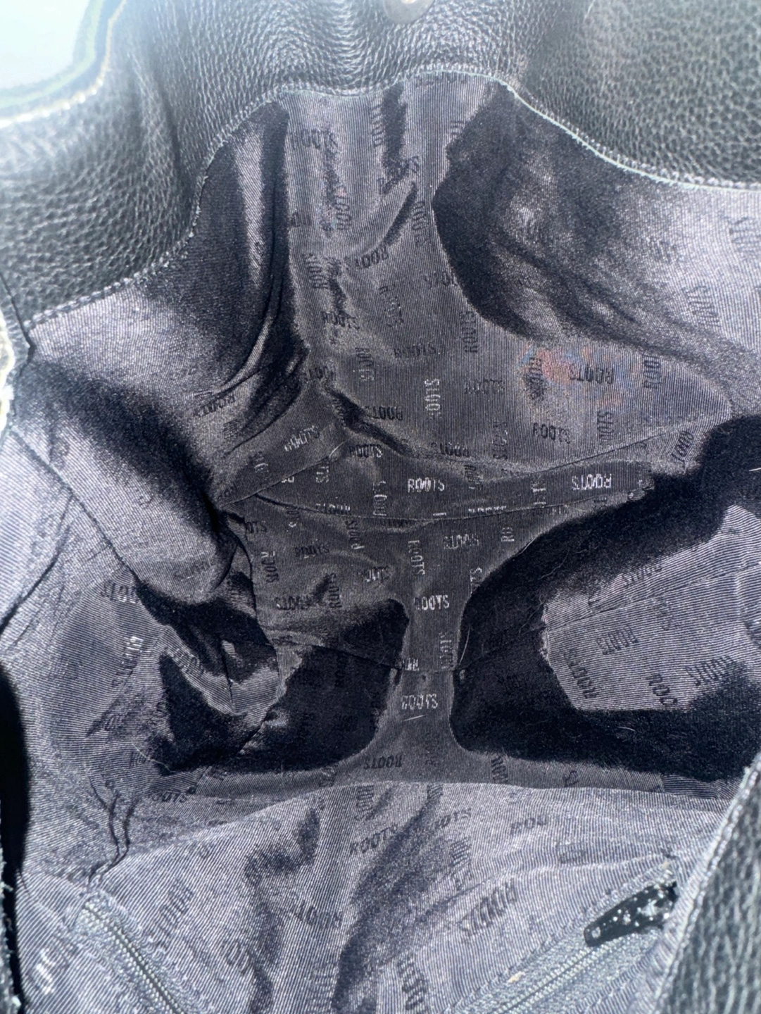 Black leather shoulder bag. Features a long adjustable strap and zipper closure. Inside lining shows Roots branding. Excellent for everyday use.