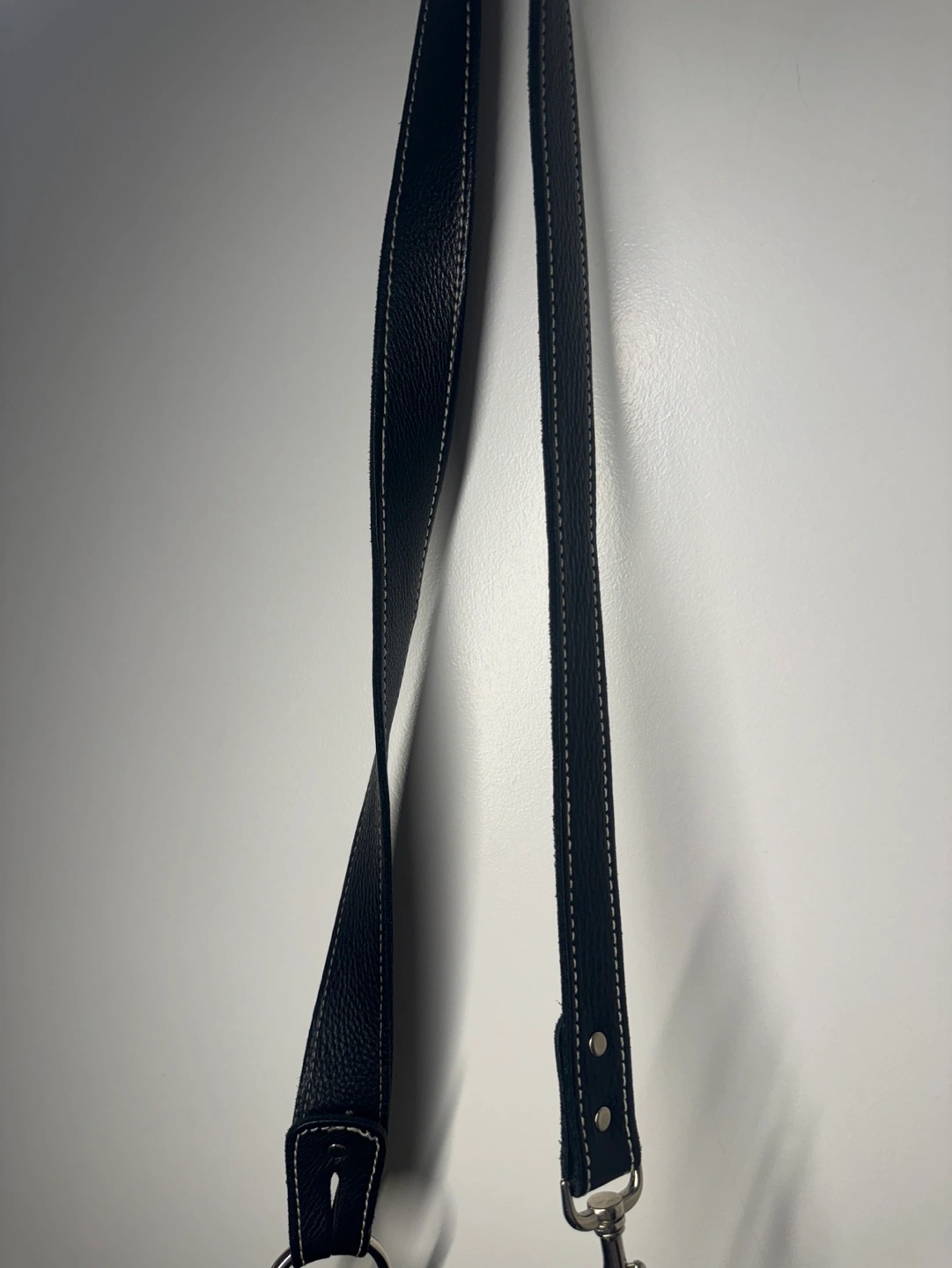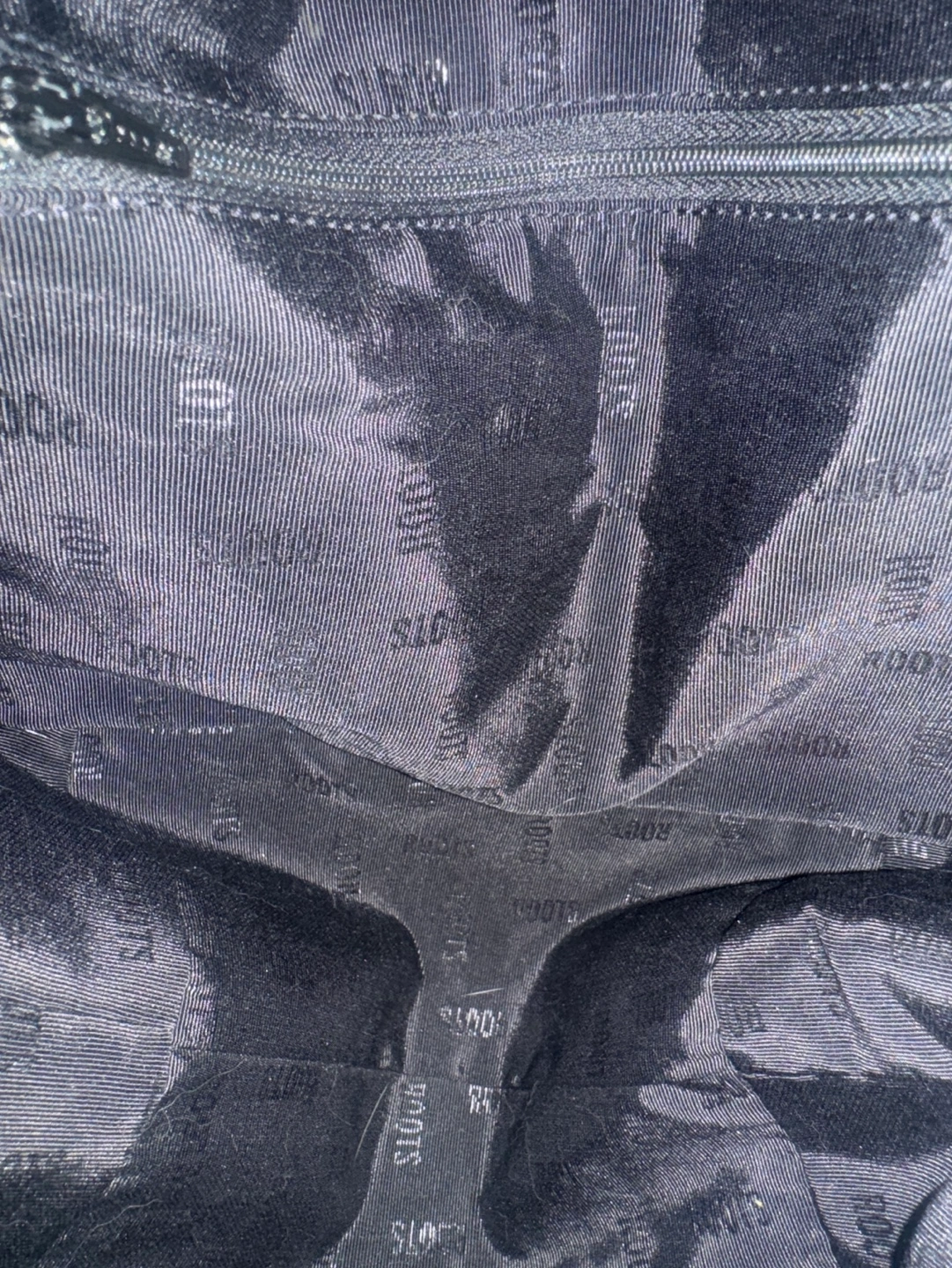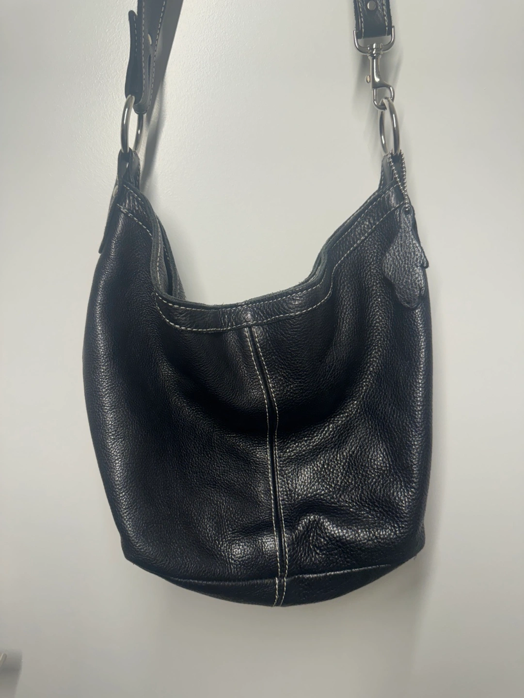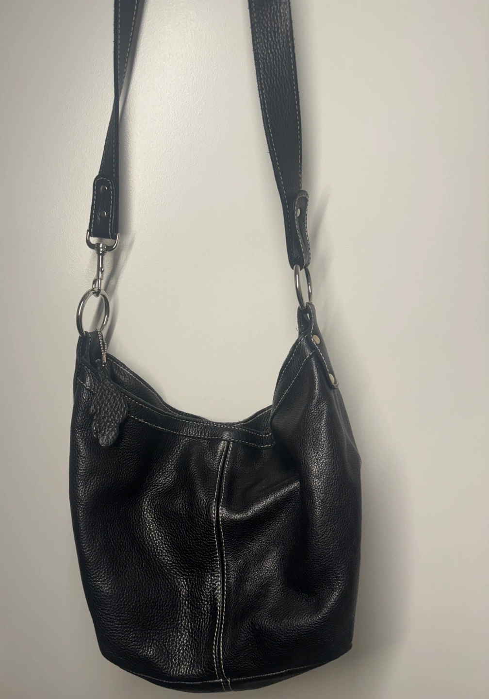 Black leather shoulder bag. Features a long adjustable strap and zipper closure. Inside lining shows Roots branding. Excellent for everyday use.