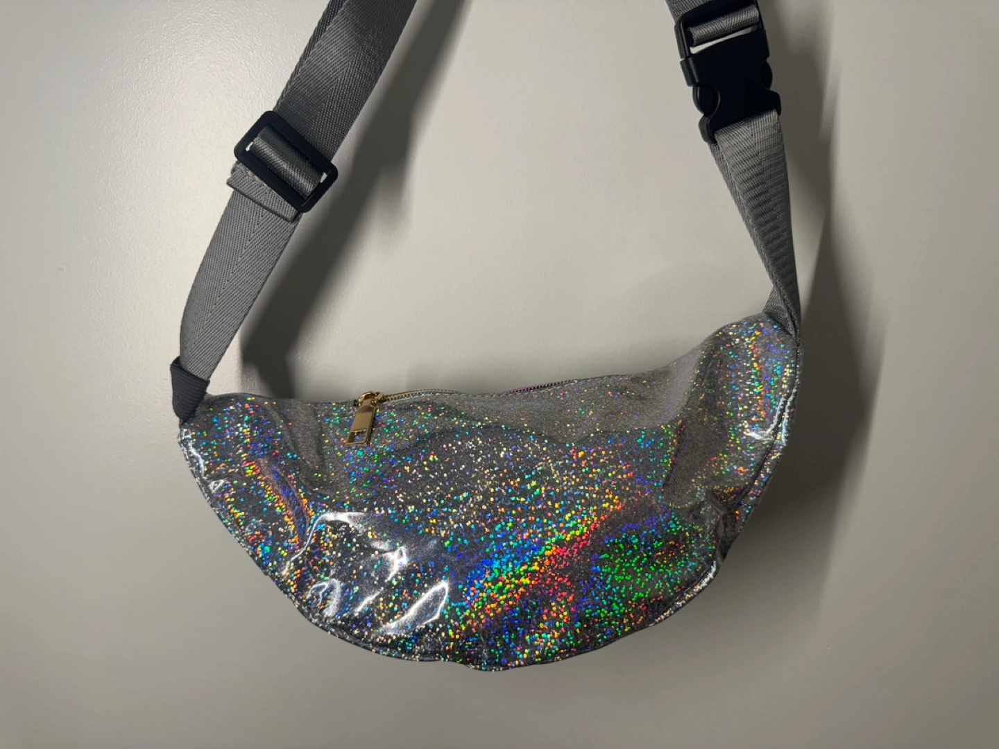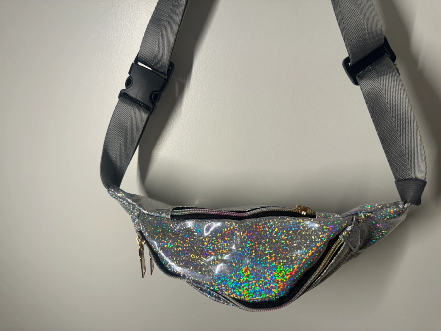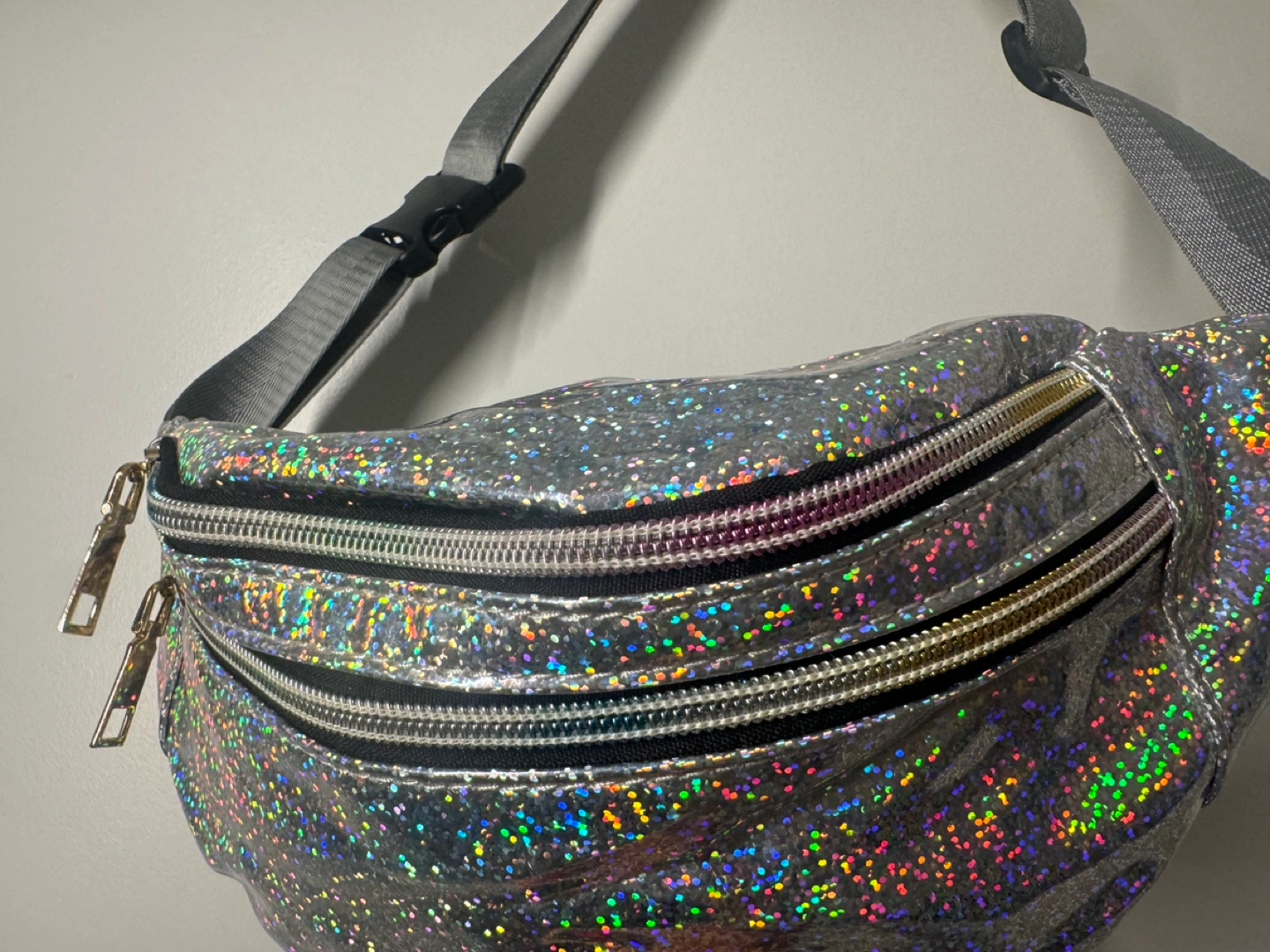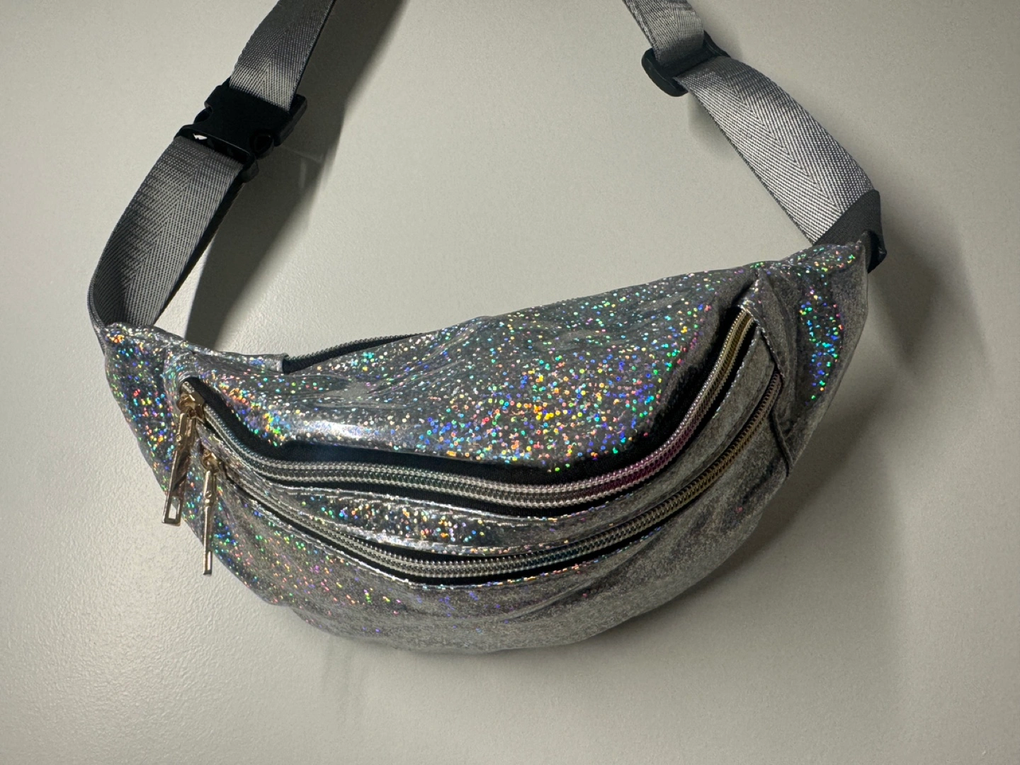 Silver iridescent glitter fanny pack. Adjustable grey straps. Two zippered compartments. Perfect for festivals or everyday use.