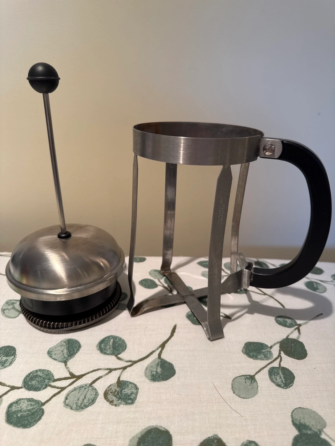 Stainless steel French press. Separate components. Handle and press included. The glass insert shattered so it will need to be replaced. Meet up available only at Markville Mall