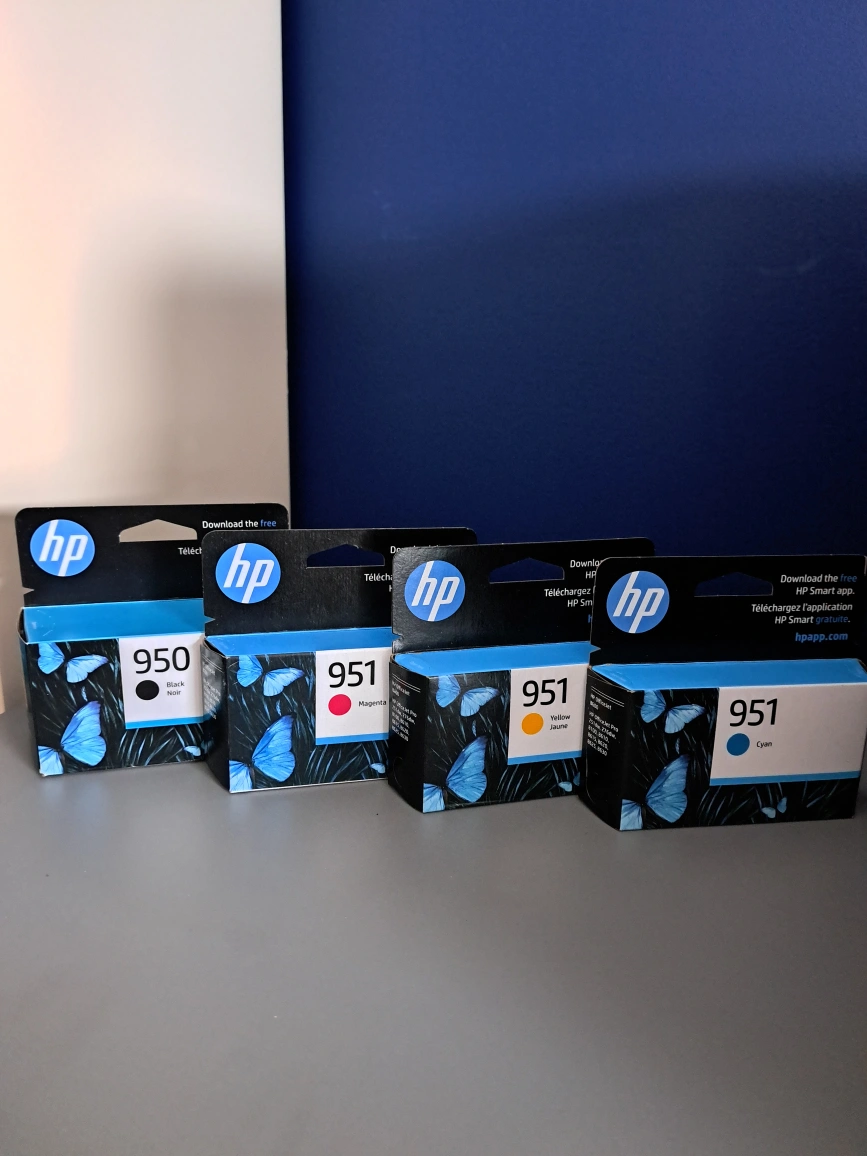 Four HP ink cartridges. Black, magenta, yellow, and cyan. Number 950 and 951. Purchased in October from Amazon for $175. Never opened.