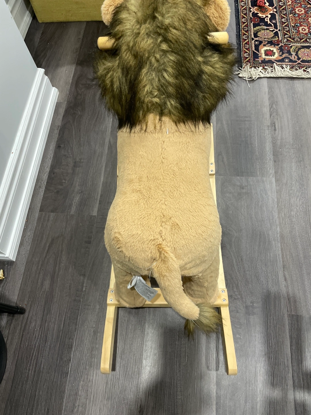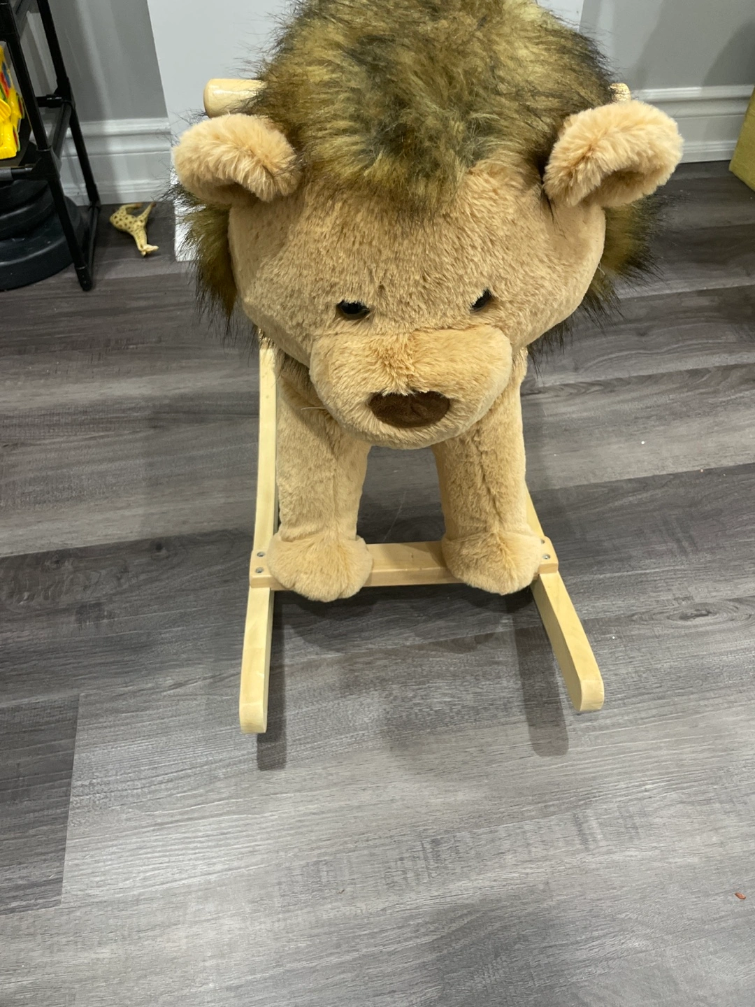 Tan coloured plush lion rocker. Wooden base. Great for toddlers. Gently used.