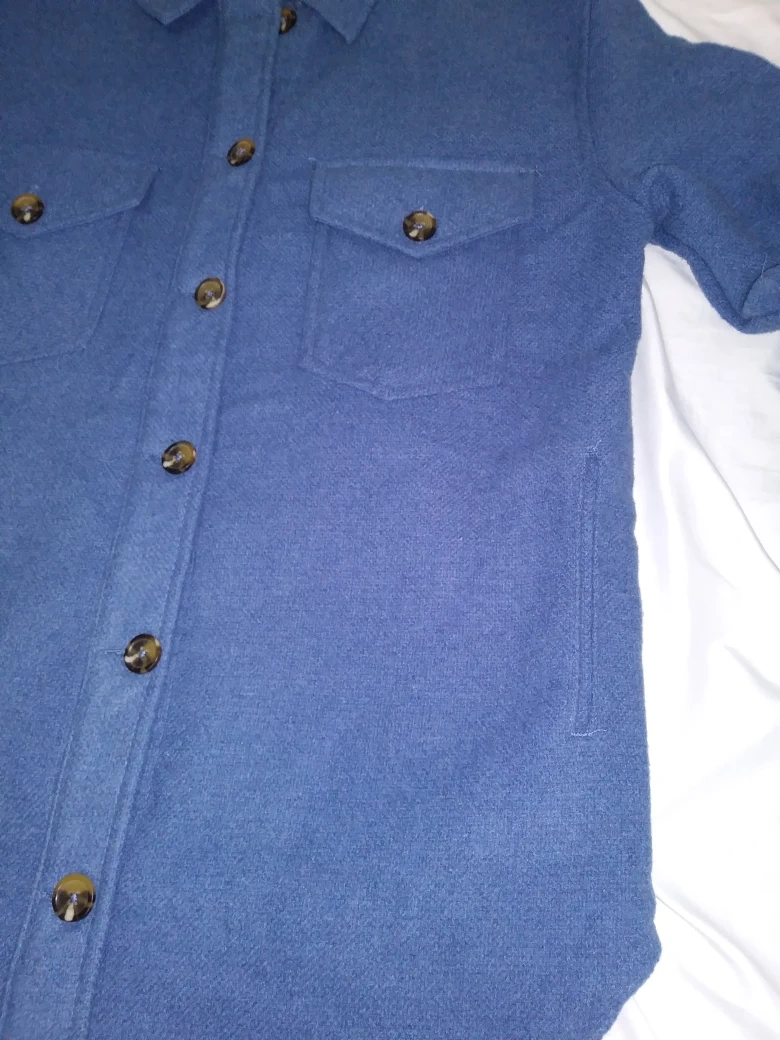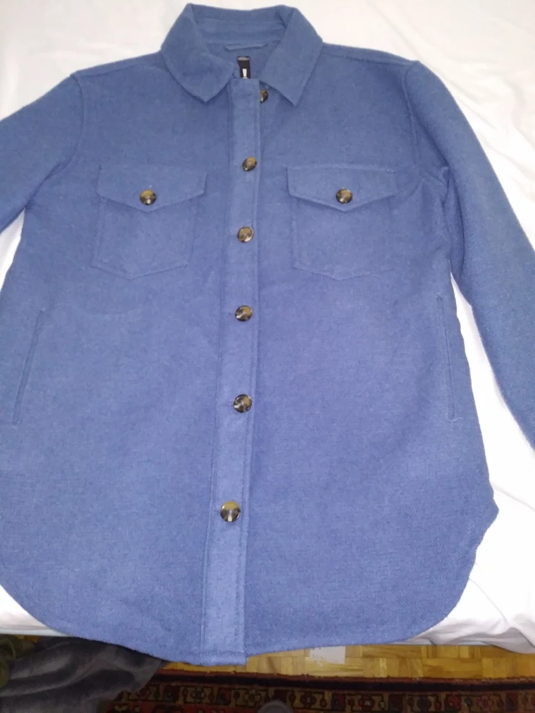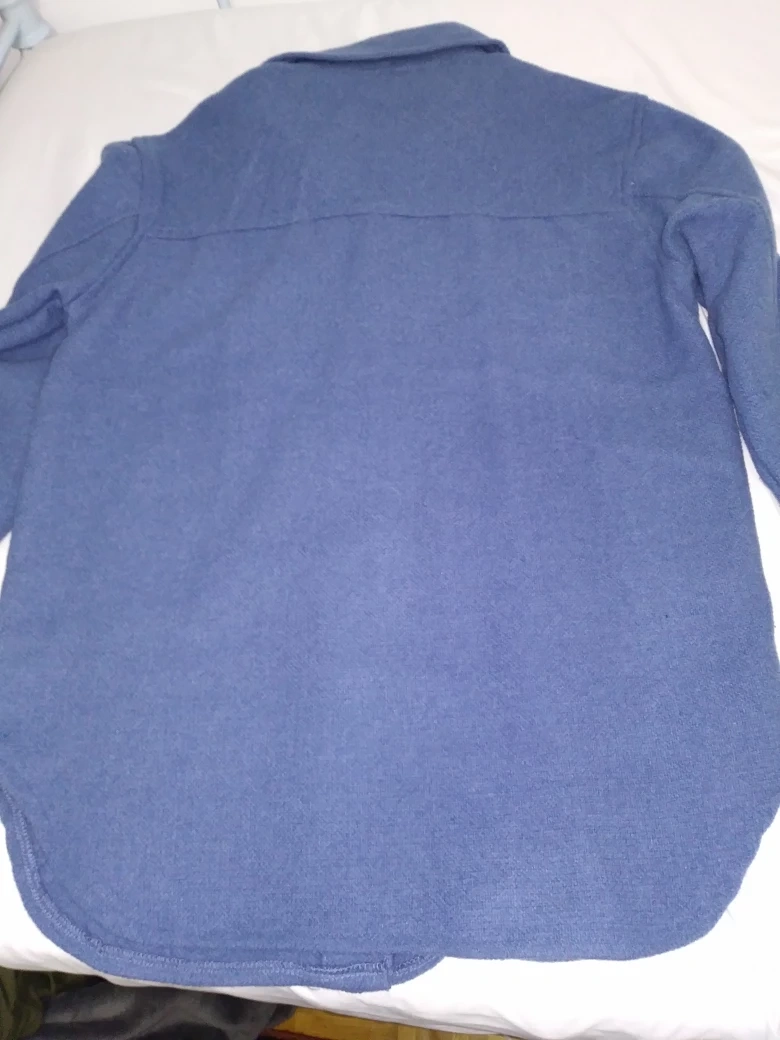 Womens button-up shirt. Size small. Blue colour. Long sleeves. Two chest pockets and two side pockets