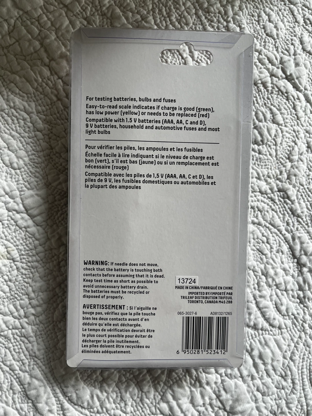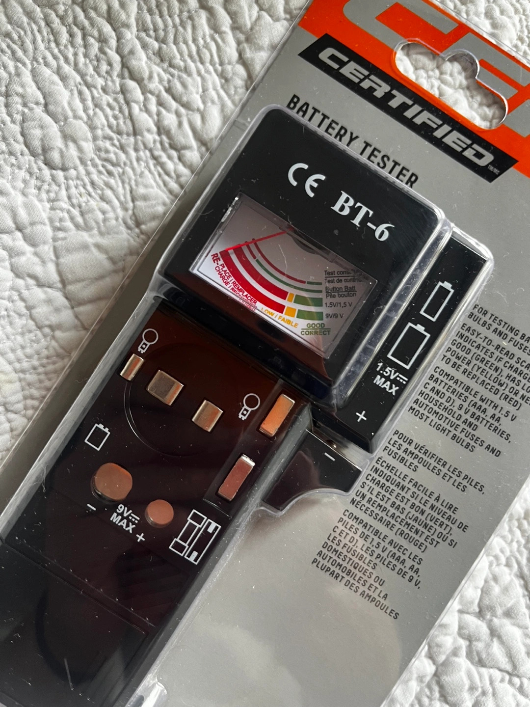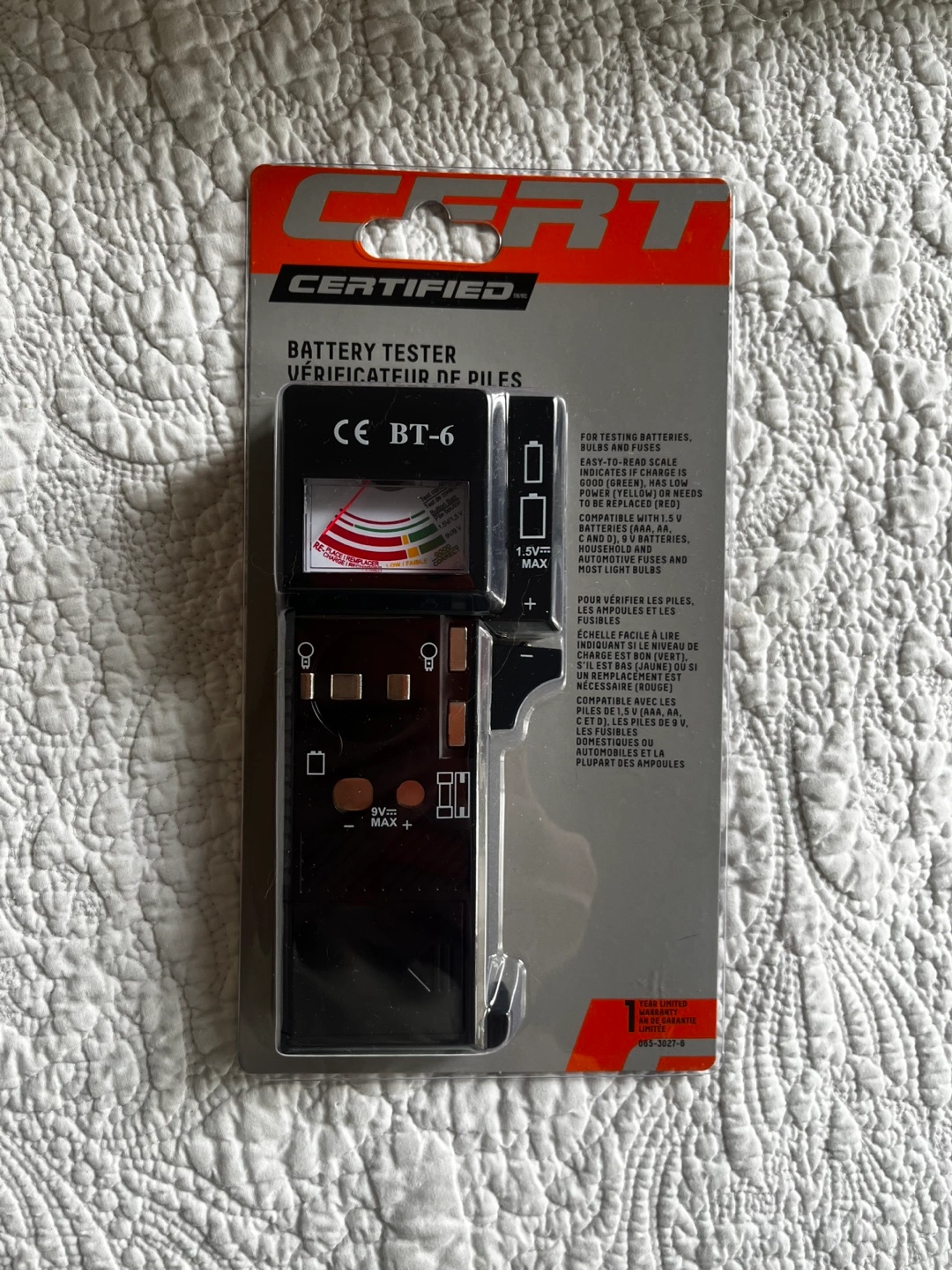 Battery tester for 1.5V and 9V batteries. Easy-to-read scale indicates if battery is good, needs charge or replacement. Compatible with AA, AAA, C and D batteries, household and automotive fuses and most light bulbs.