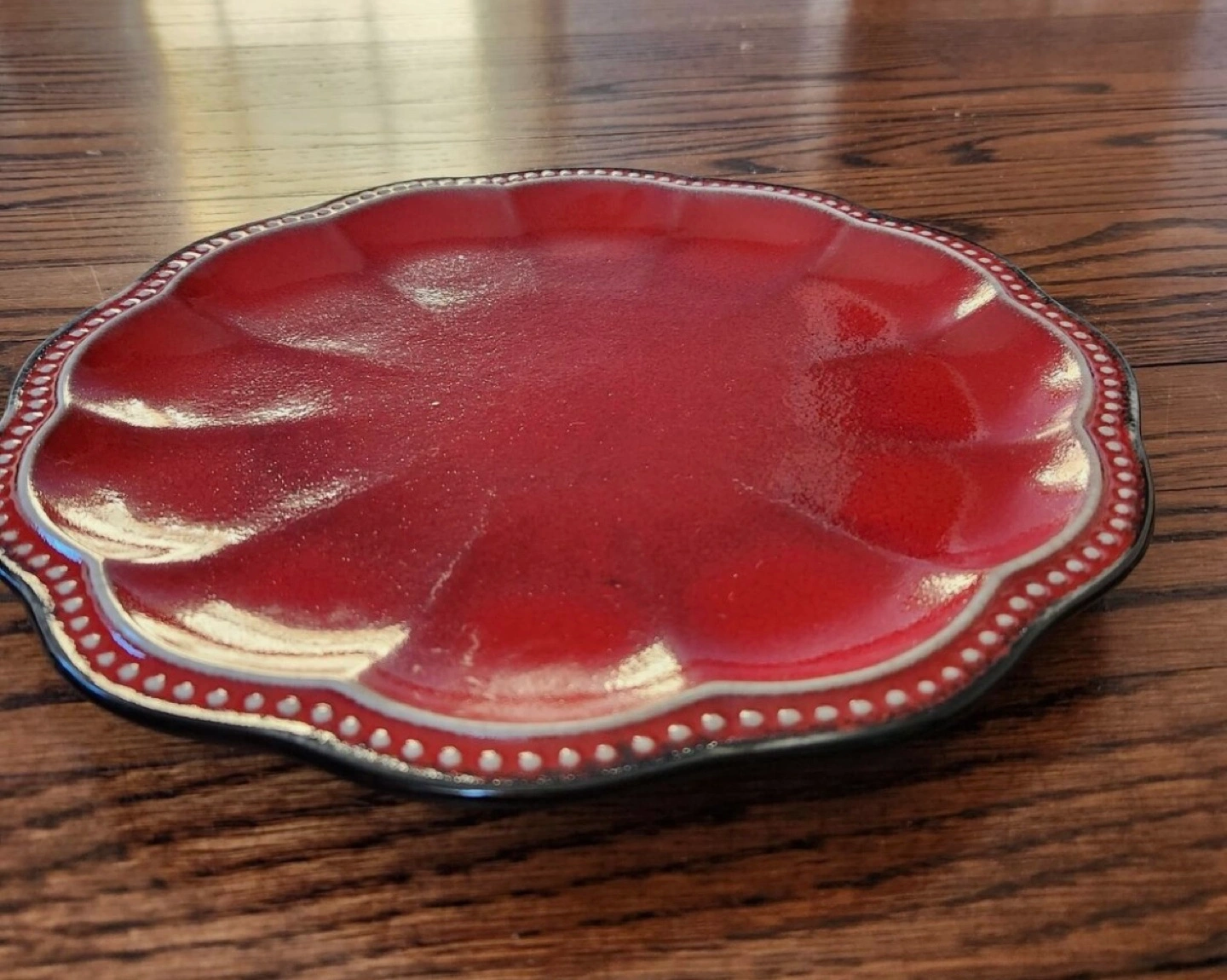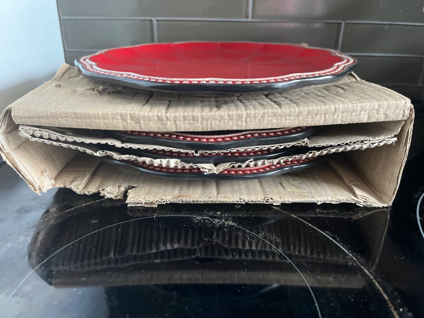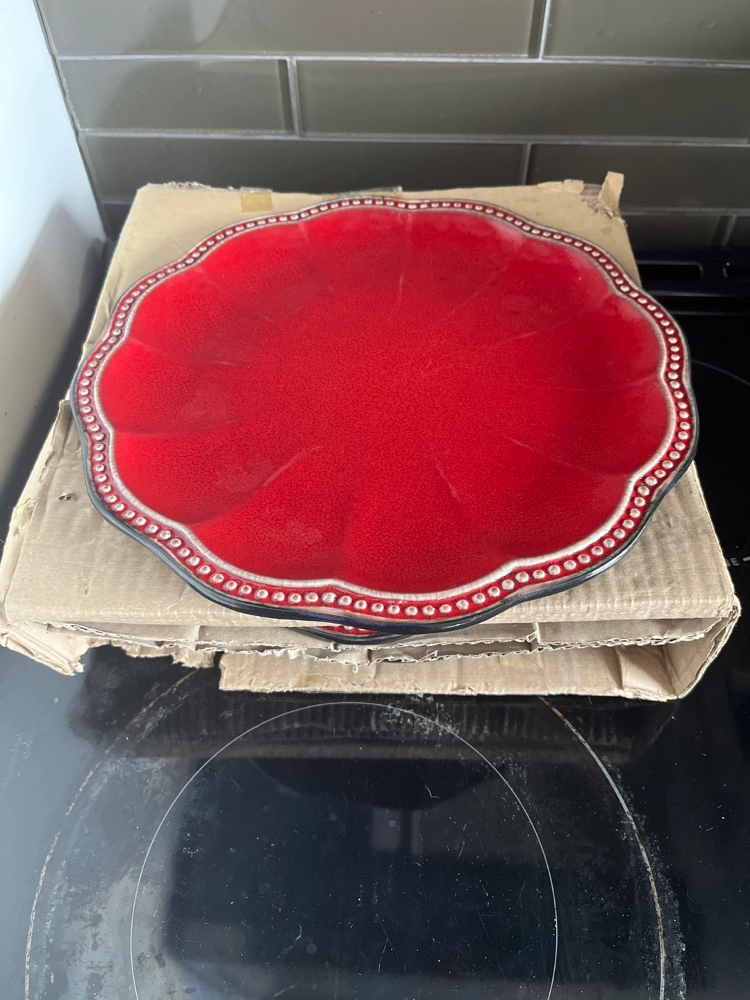 Brand new Set of four red dinner plates. Stoneware. Microwave and dishwasher safe. Scalloped edges with small white bead detailing. Also selling 6 bowls separately You can pick up by Carlton and Jarvis area
