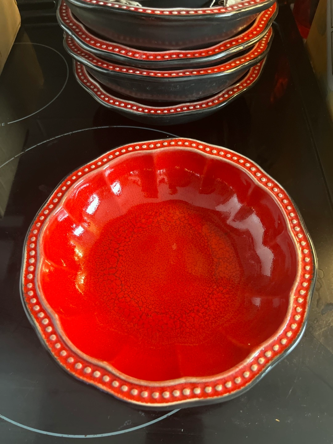 Brand new Set of 6 stoneware bowls. Red and dark grey. Dishwasher and microwave safe. Approximately 6 inches in diameter. Also have 4 plates selling separately but will give you a deal if your take all You can pick up by Carlton and Jarvis area