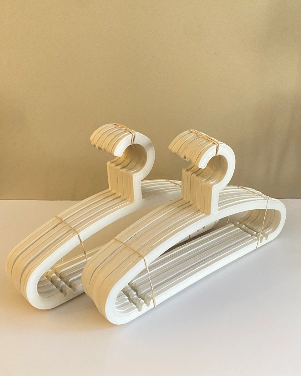 Two bundles of ten off-white plastic hangers.