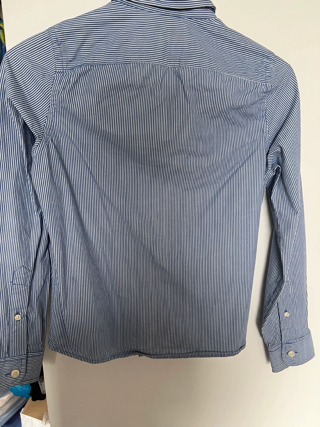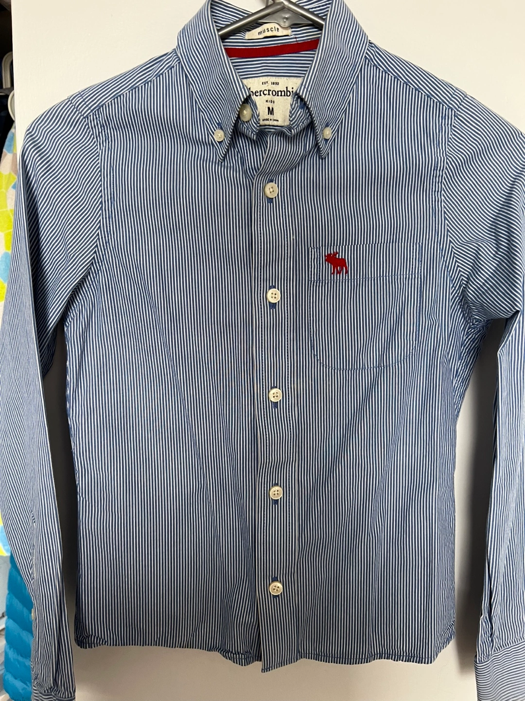 Blue and white striped long-sleeve button-down shirt. Size medium. Small embroidered moose logo on chest pocket. Great for school or casual wear.