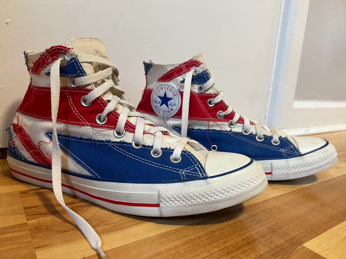 Rare Vintage Converse All Star high-top sneakers. Distressed Union Jack design. Classic canvas material. Pre-owned.