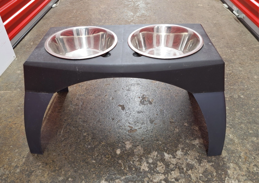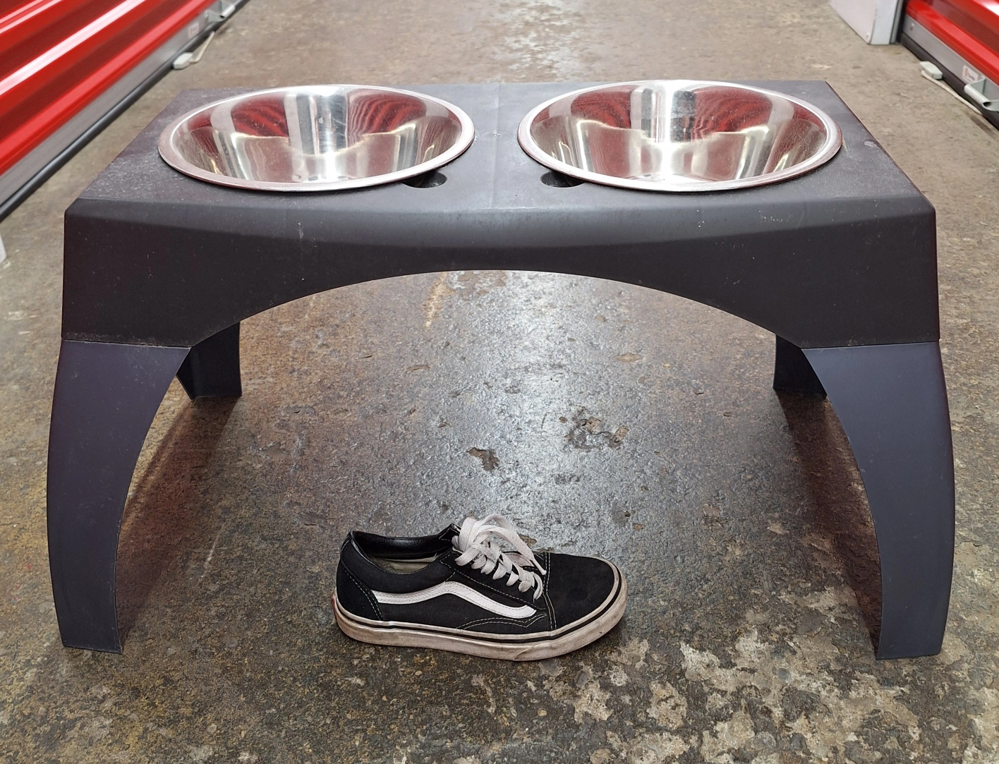 Black plastic elevated dog feeder. Two stainless steel bowls. Great for larger dogs. Durable and easy to clean. Excellent condition. Women's size 6 sneaker for scale in second photo. (also for sale!) Proceeds to cat rescue, Kit Cat Club Of Hamilton Upper Wentworth and Queensdale area Hamilton mountain Currently in storage downtown
