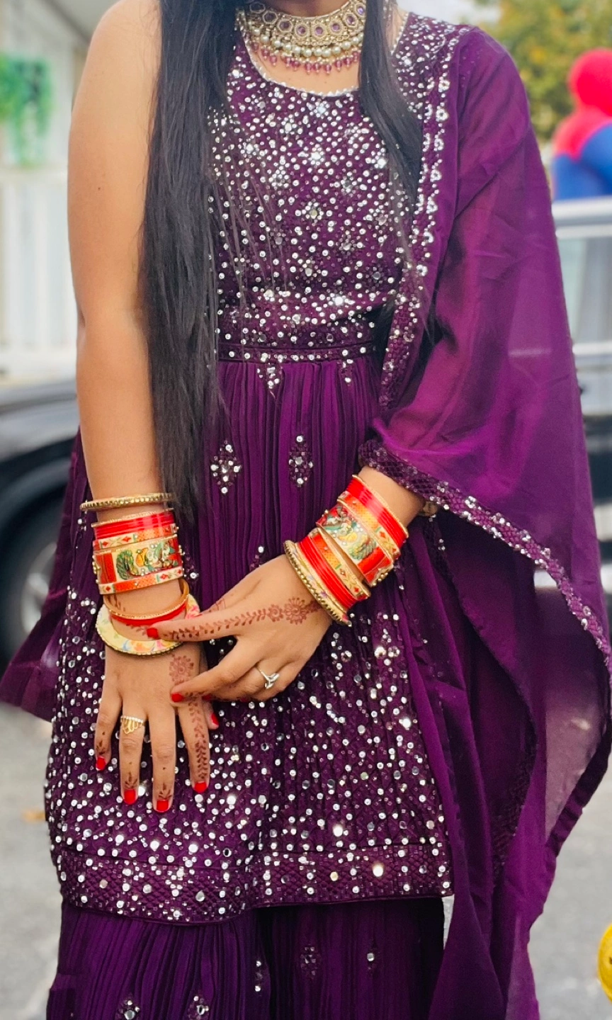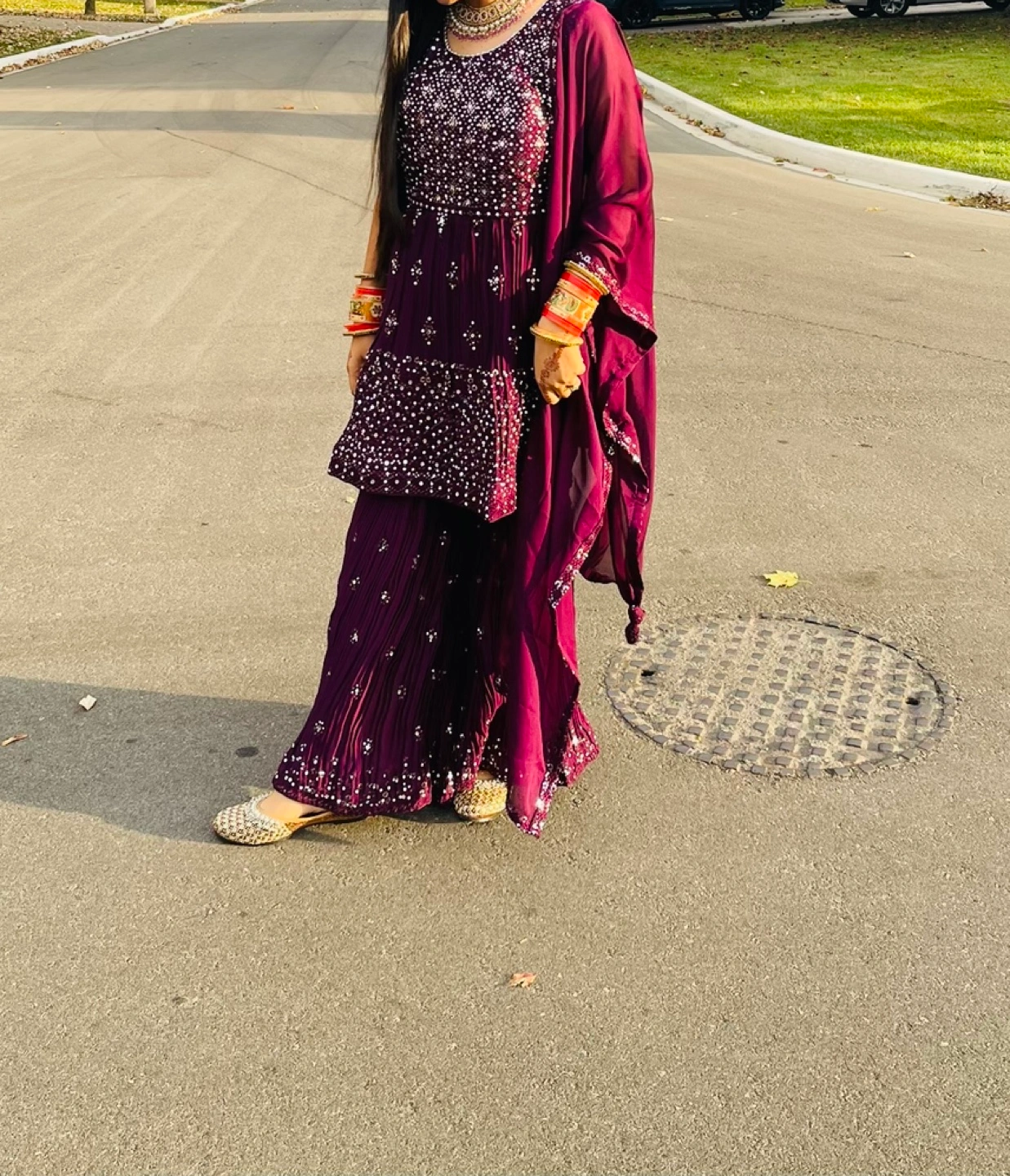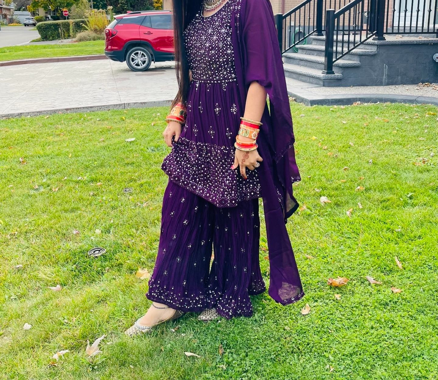 Beautiful purple sharara suit. Intricate embellishments throughout. Pleated palazzo pants and a flowy dupatta. Perfect for special occasions.