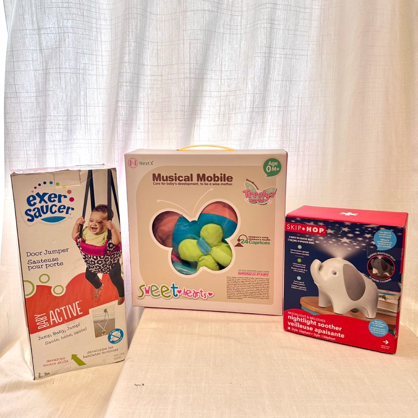 $20 Cash ONLY for all 3 items, must be picked up by Lansdowne Avenue & Dundas Street West. Skip Hop Nightlight Soother Elephant: Adorable elephant nightlight soother. Plays sounds and projects lights. Includes power cord and instruction manual. Exersaucer Baby Active Door Jumper: Baby door jumper. Pink and black floral design. Develops motor skills. Includes all parts shown. MUSICAL MOBILE, PLUSH ANIMALS & SEA CREATURES Musical mobile for baby's crib. Features soft plush animals and a rotating design. Plays children's songs. Suitable for newborns and up. Includes easy-to-attach crib clamp.