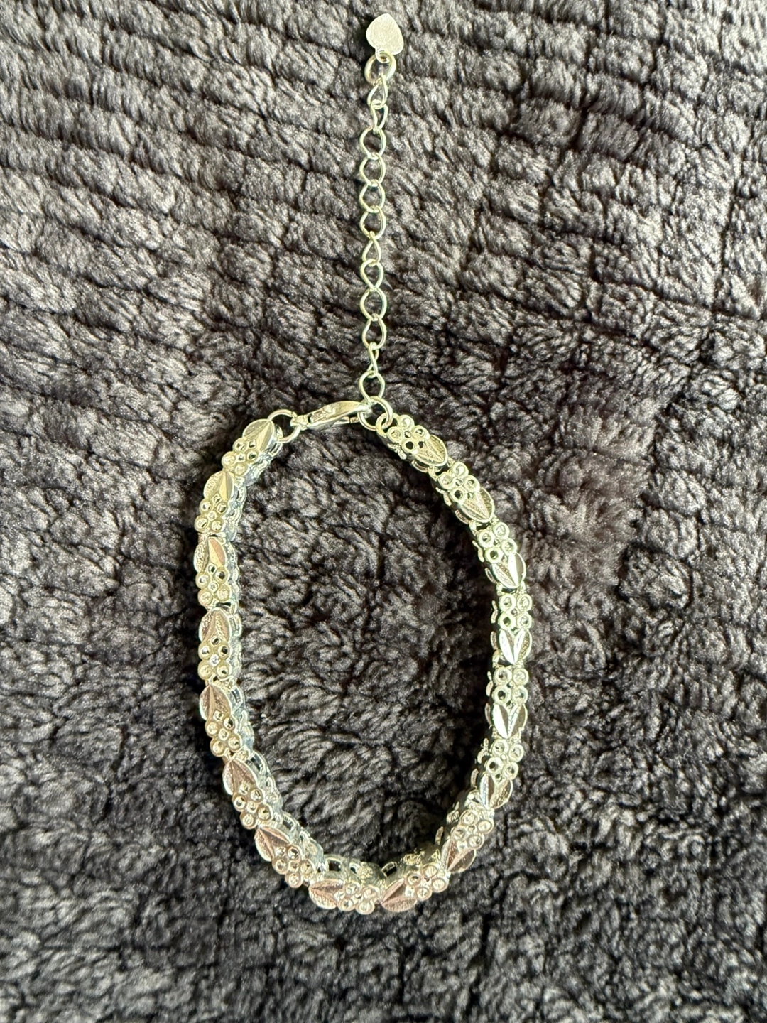 Dainty silver bracelet. Features filigree design. Lobster clasp closure. Adjustable length.