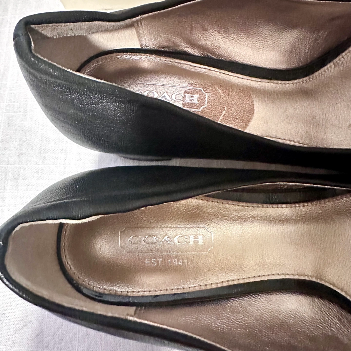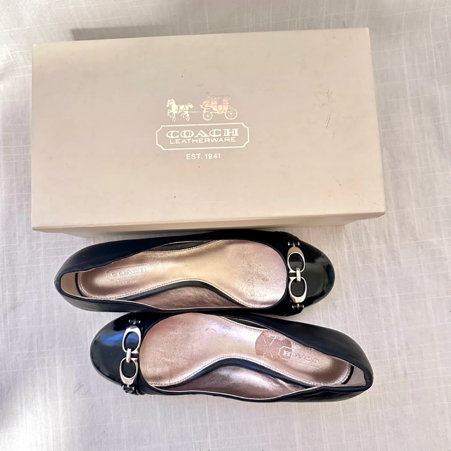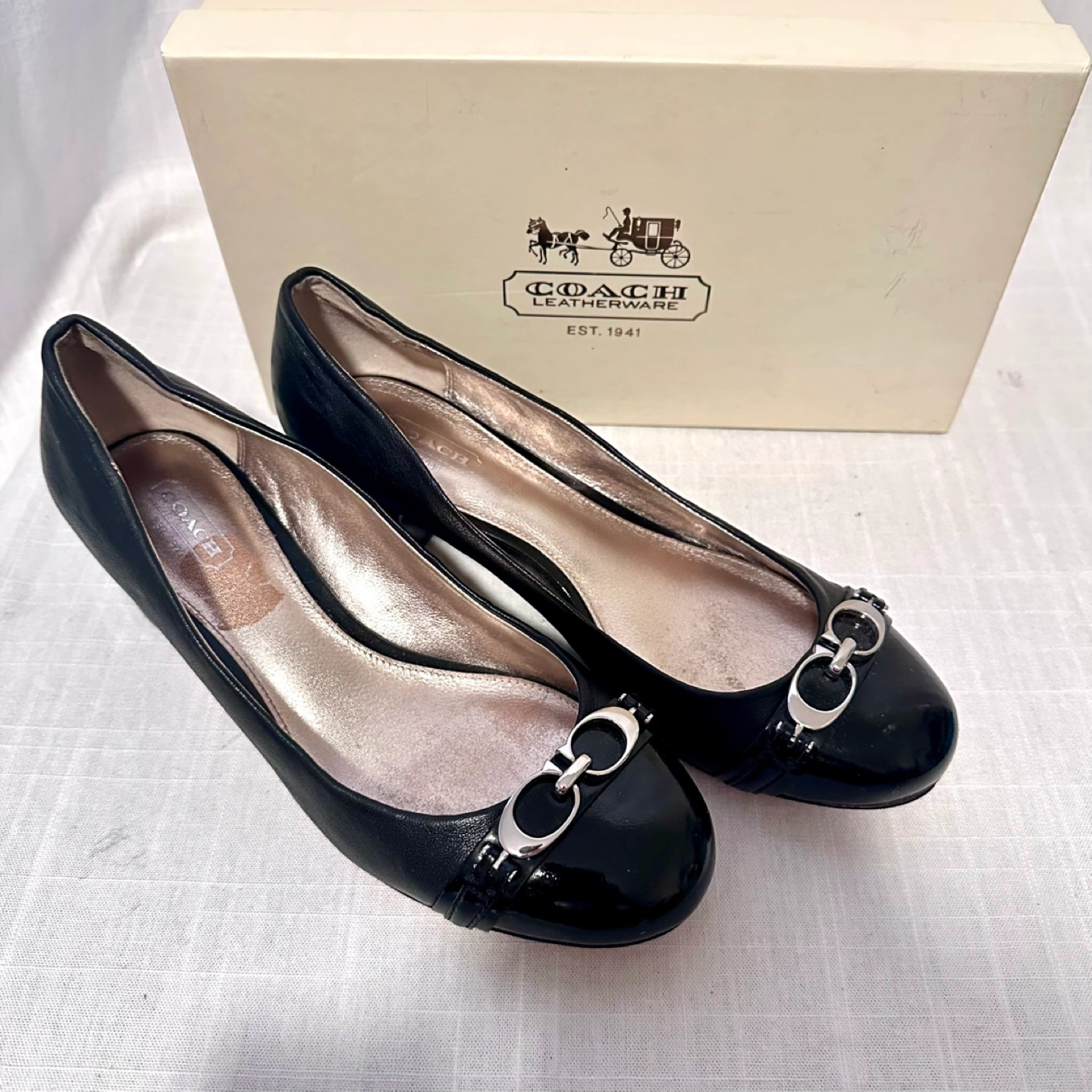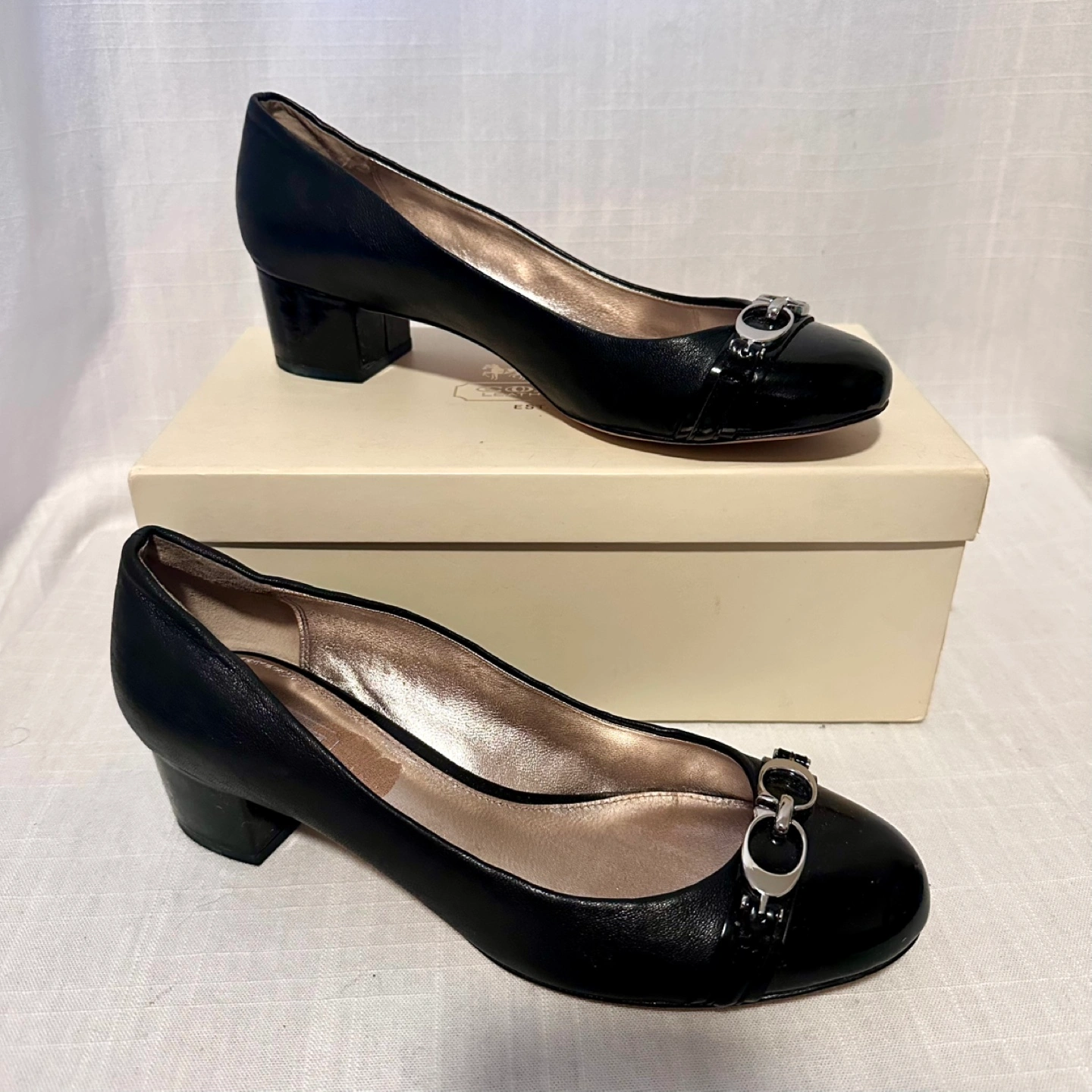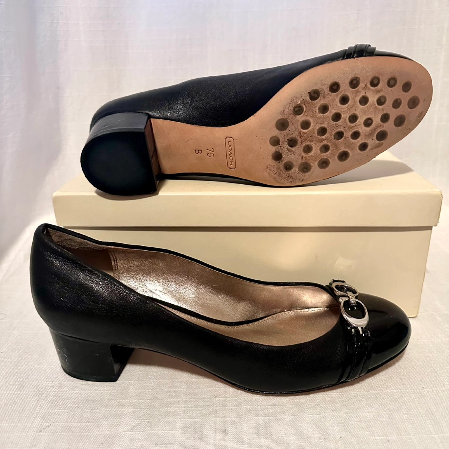 Black leather Coach pumps. Low block heel. Patent leather toe cap. Silver-tone hardware accents. Size 7.5B. Comes in original Coach box. Cash ONLY, must be picked up by Lansdowne Avenue & Dundas Street West. Pet Free and Smoke Free Home.