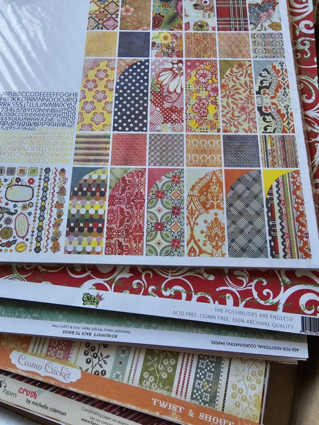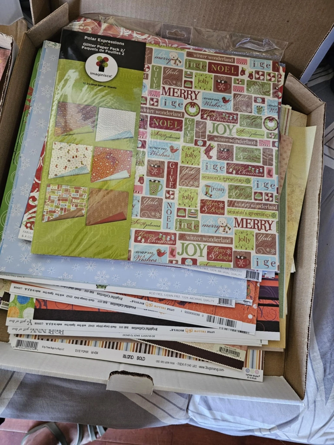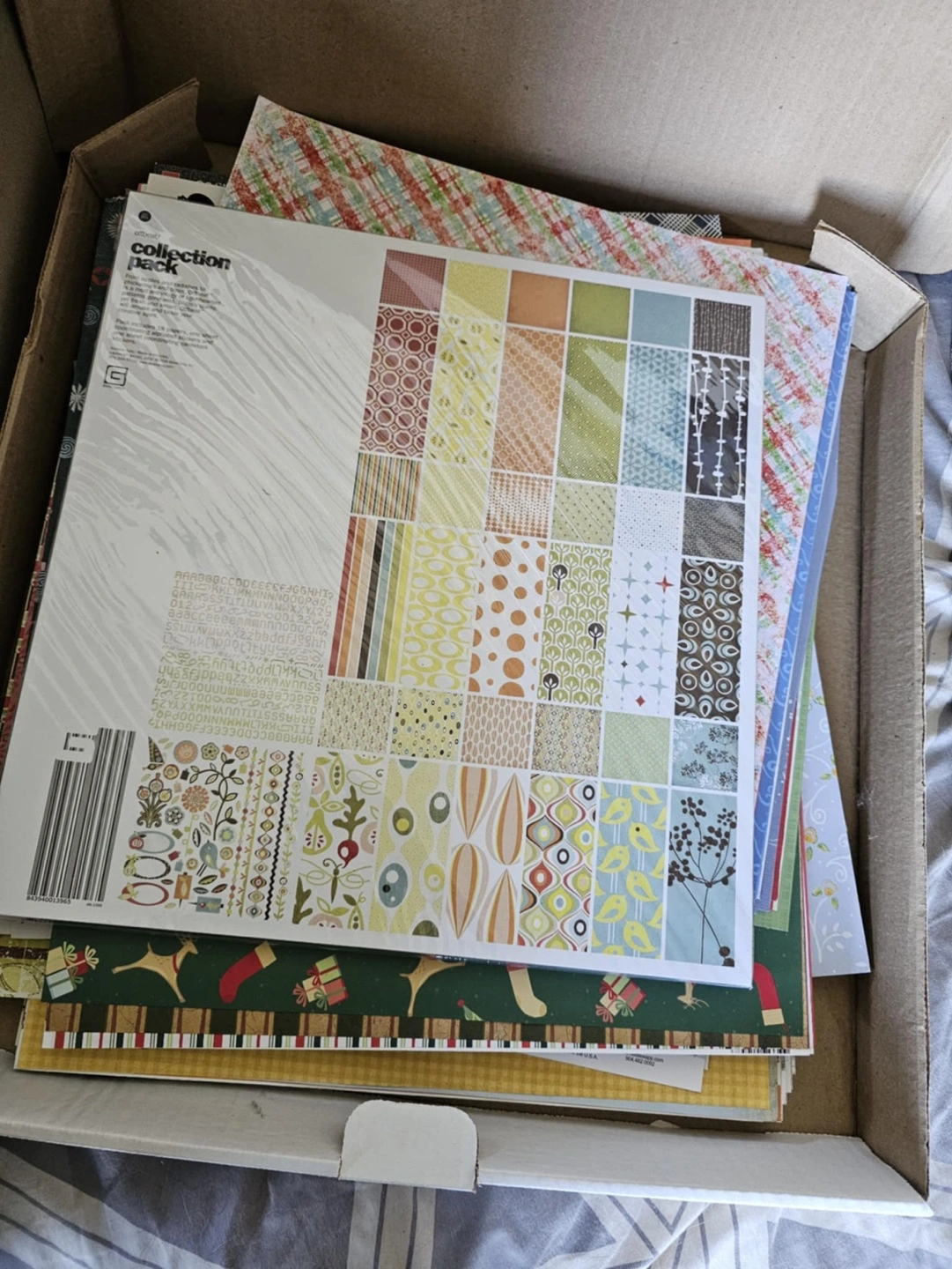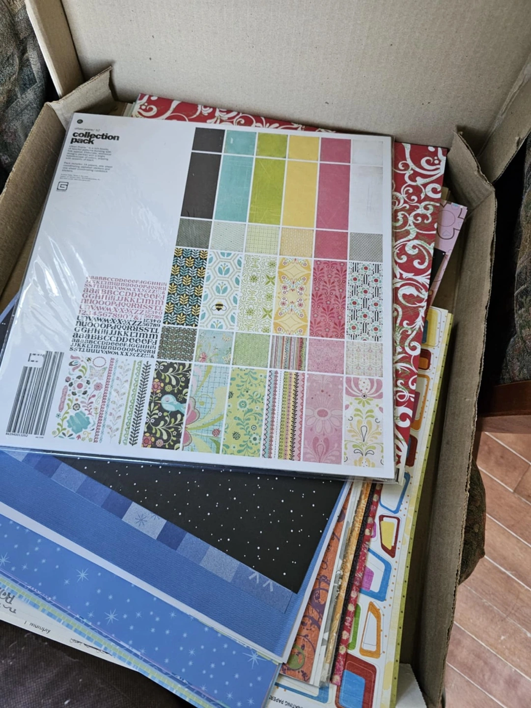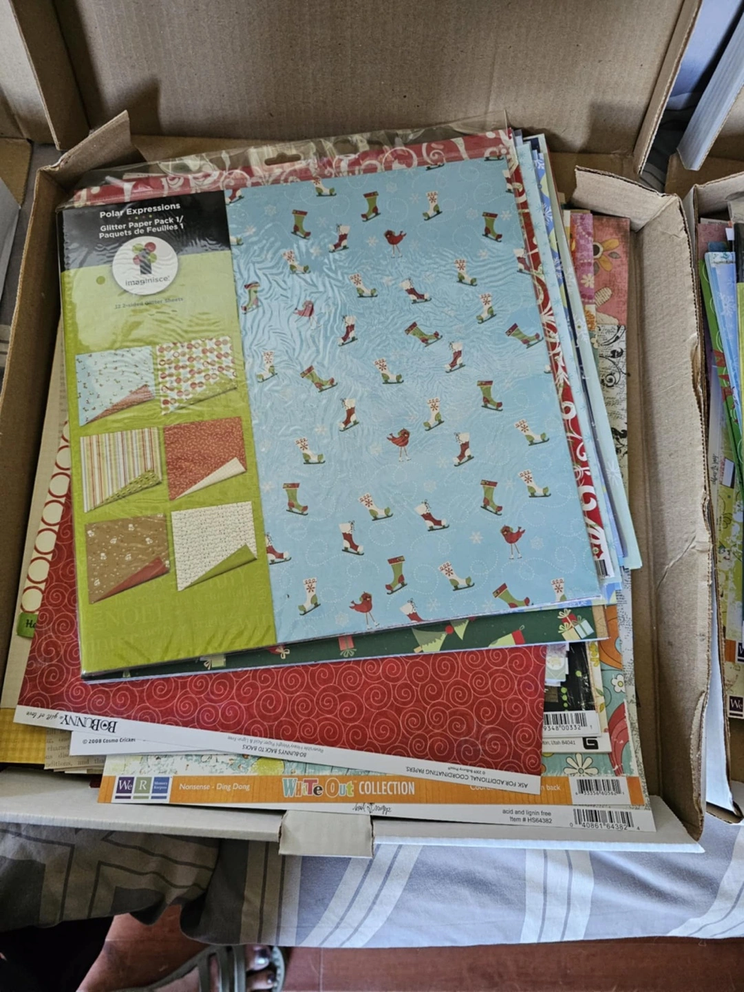 Large collection of scrapbooking paper. Various patterns and colours. Some papers are in sealed packages. Ideal for crafting and paper projects. 10 boxes of mixed scrapbook papers, cardstock, etc. Over 150 pieces in each. Most are printed, could be Christmas, Halloween, seasonal. Each one may have other random scrapbook pads of paper, overlays, etc. each box is $20 pick up in lower truro! can come look through boxes and pick which one you want