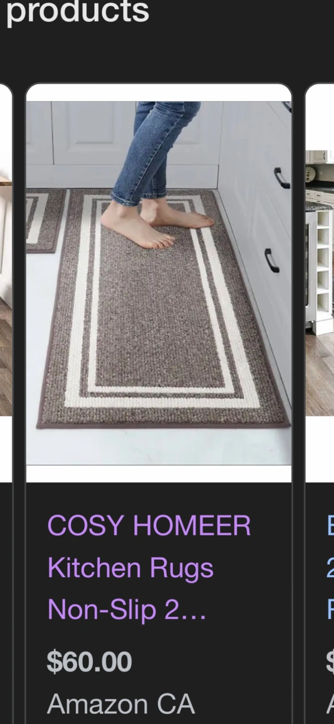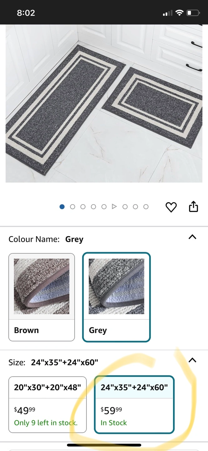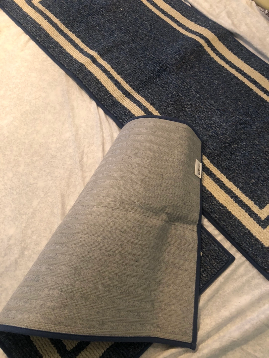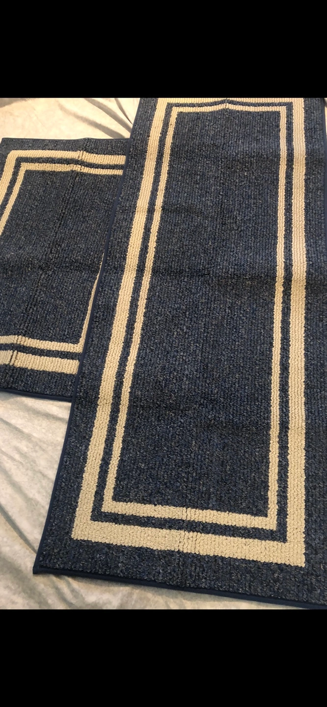 Two-piece kitchen rug set. Navy blue with off-white border. Non-slip backing. Great for kitchen or bathroom.