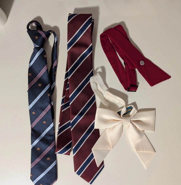 Four neckties included. Two classic striped ties, one maroon and one navy blue with crown accents. One maroon clip-on tie and one off-white pre-tied bow tie. Great for school uniforms or special occasions. $5 for all Address: brimley & pitfield Porch pick-up and shipping available.