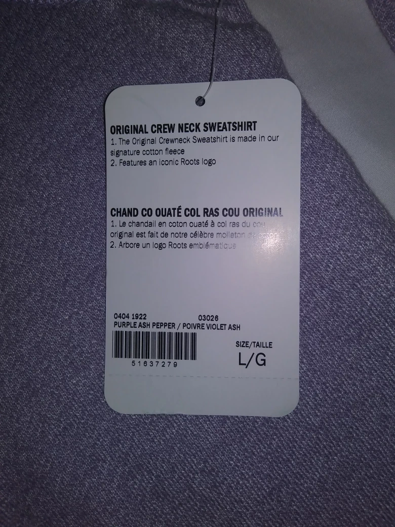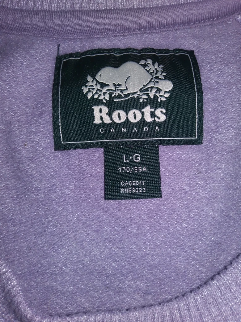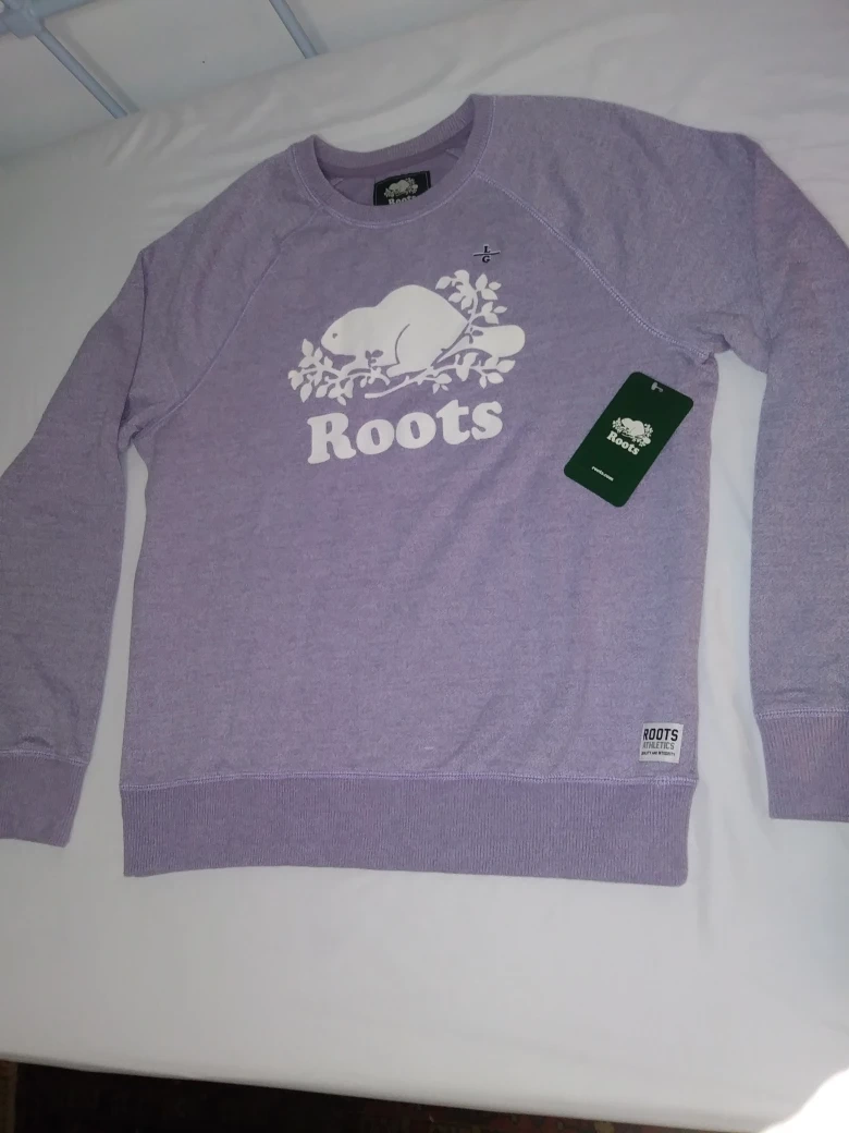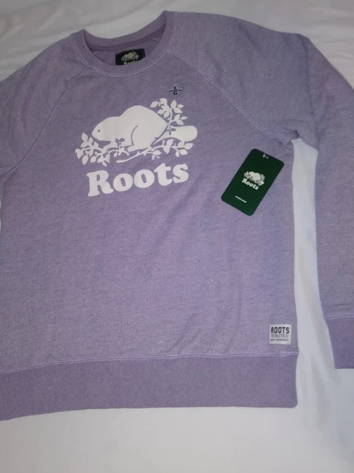 Lavender purple Roots crew neck sweatshirt. Features iconic Roots beaver logo. Size large. New with tags.