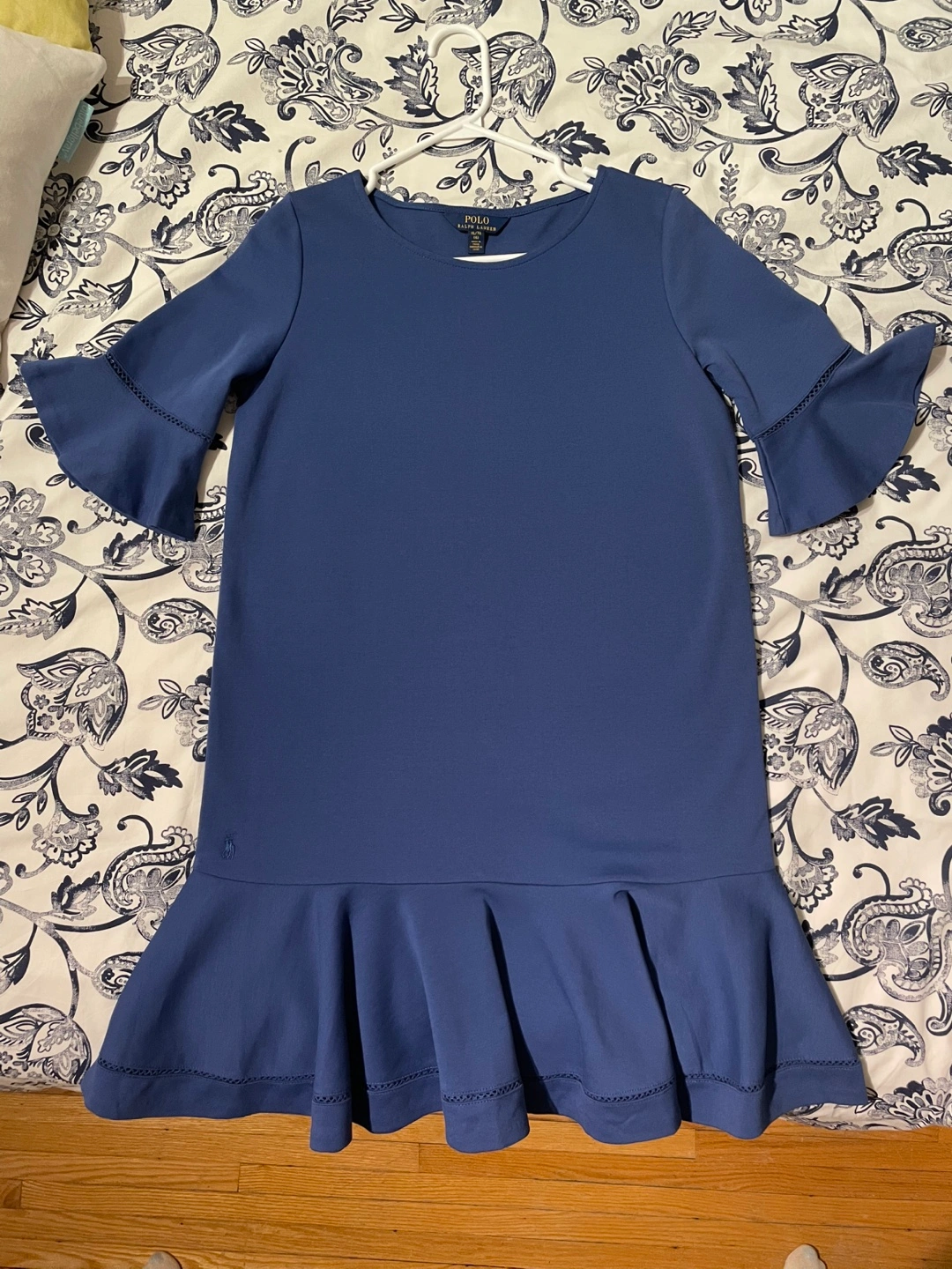 Beautiful dark blue dress. Features a flared hem and elbow-length sleeves with ruffled detailing. Great for special occasions or everyday wear.