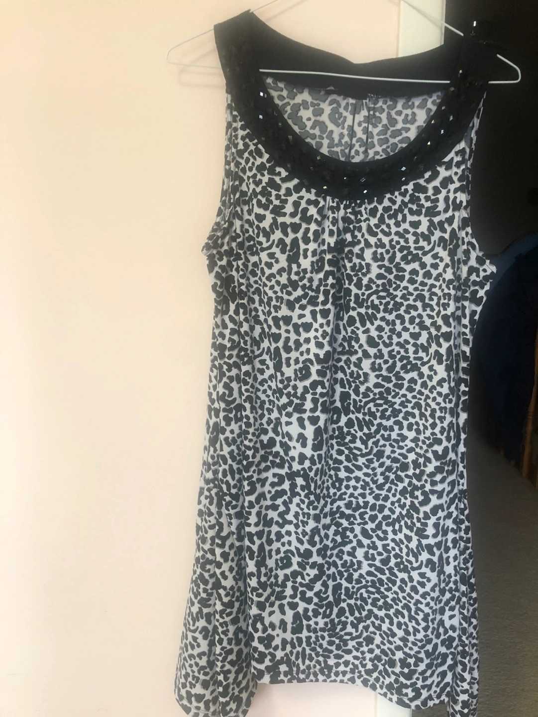 White and black animal print sleeveless top. Features a black neckline embellished with dark grey stones. Relaxed fit. With 21 chest and waist. And 36 bottom width