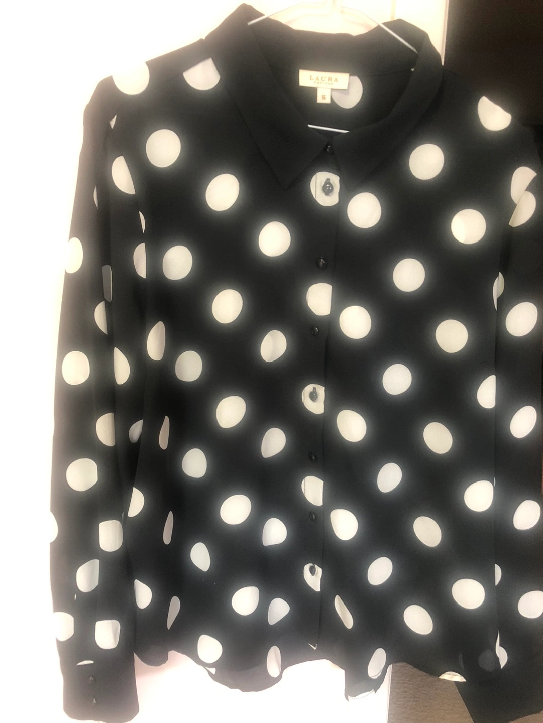 Long sleeve button-up blouse. Black background with off-white polka dots. Size 16. Wrinkles free