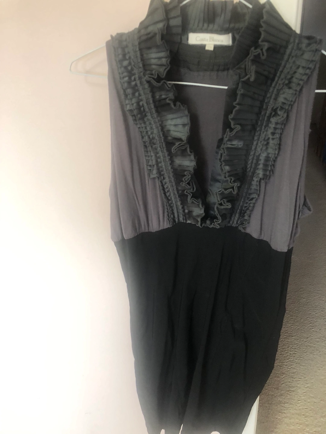 Beautiful sleeveless dress. Grey top with black pleated detail and black bottom. V-neck.