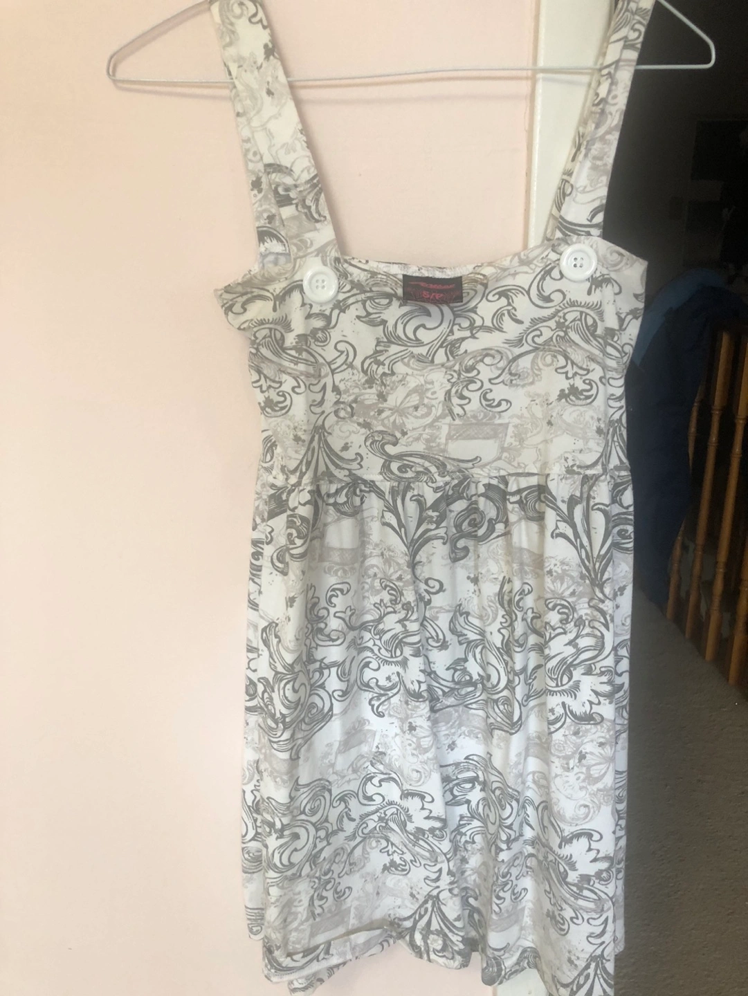 Cute summer dress. Features a monochrome pattern and adjustable straps. Two buttons on the straps. Perfect for a casual summer look.