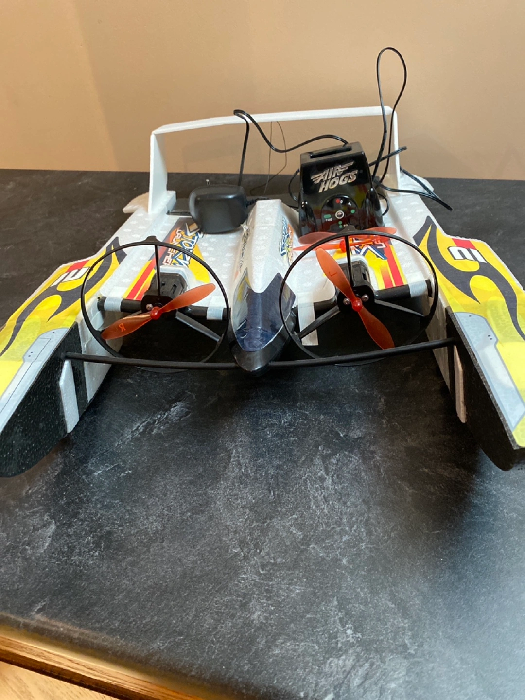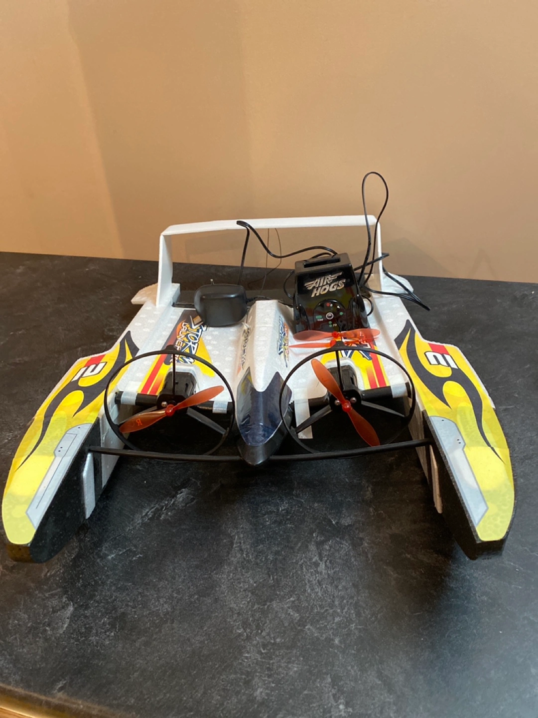 Air Hogs remote control hydrofoil boat. Includes boat, remote, and charger. Ready to enjoy some fun on the water! Requires batteries. AA. 6. For controller. It can fly Never flown in air. Or best offer