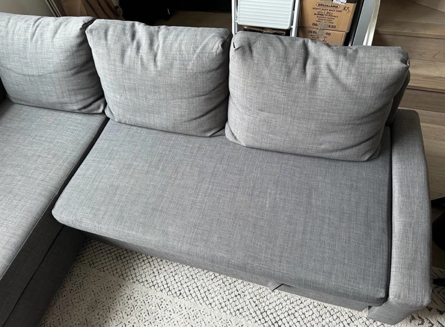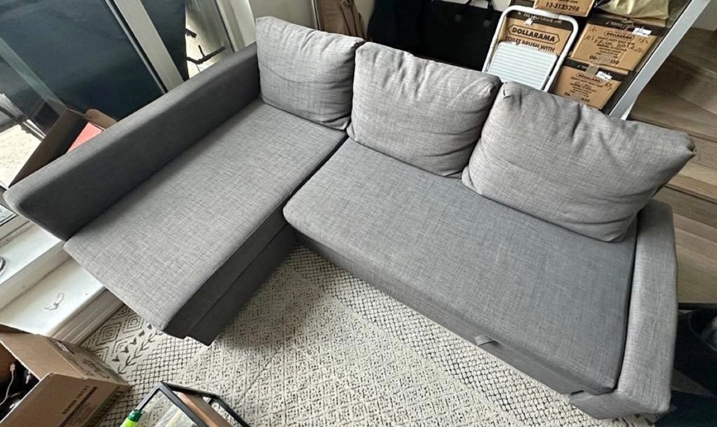 Grey fabric sectional sofa bed. Pull-out bed and storage. Good condition. Grey fabric corner sofa bed. Pull-out bed mechanism. Three back cushion. Selling this grey Ikea Friheten sofa futon. Very comfortable, it's used but has been maintained in very good condition. It also has a good amount of storage that can be used for blankets, pillows, etc.From a pet friendly home. Few scratches here and there. Measurements/Dimensions: Depth: 151 cm (59 1/2 ") Bed width: 140 cm (55 1/8 ") Bed length: 204 cm (80 3/8 ") Height including back cushions: 86 cm (33 7/8 ") Backrest height: 66 cm (26 ") Width: 230 cm (90 1/2 ") ๐ข๐ขNOTE: CAN DELIVER FOR EXTRA ๐๐๐จ๐ญ๐: ๐๐ข๐๐ค๐ฎ๐ฉ ๐ฉ๐ซ๐๐๐๐ซ๐ซ๐๐ ๐๐ฎ๐ญ ๐๐๐ง ๐๐๐ฅ๐ข๐ฏ๐๐ซ ๐ฐ๐ข๐ญ๐ก ๐๐ง ๐๐ฑ๐ญ๐ซ๐ ๐๐จ๐ฌ๐ญ ๐๐ฅ๐๐๐ฌ๐ ๐๐ก๐๐๐ค ๐จ๐ฎ๐ญ ๐ฆ๐ฒ ๐จ๐ญ๐ก๐๐ซ ๐ฅ๐ข๐ฌ๐ญ๐ข๐ง๐ ๐ฌ. ๐๐ ๐๐ซ๐ ๐ฌ๐๐ฅ๐ฅ๐ข๐ง๐ ๐ ๐ฅ๐จ๐ญ ๐จ๐ ๐ญ๐ก๐ข๐ง๐ ๐ฌ ๐ ๐ ๐ DELIVERY & ASSEMBLY INFO: Our services also include assisting with transportation between different places. If you require any item from a Marketplace or a store, such as furniture or anything else, we can help you with the delivery. If you need assembly services, I can help you with any assembly. I am Task Rabbit assembler and have been assembling for 5 years plus.