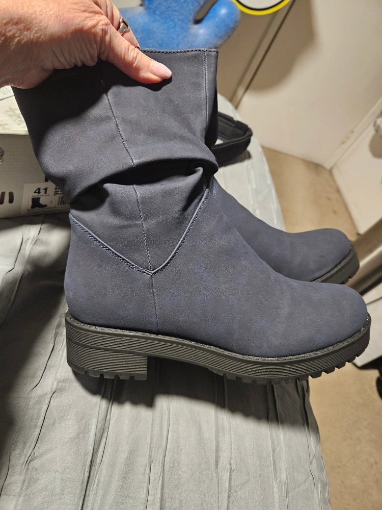 Dark blue women's ankle boots. Side zipper closure. Slightly slouchy style. Durable sole. New in box.