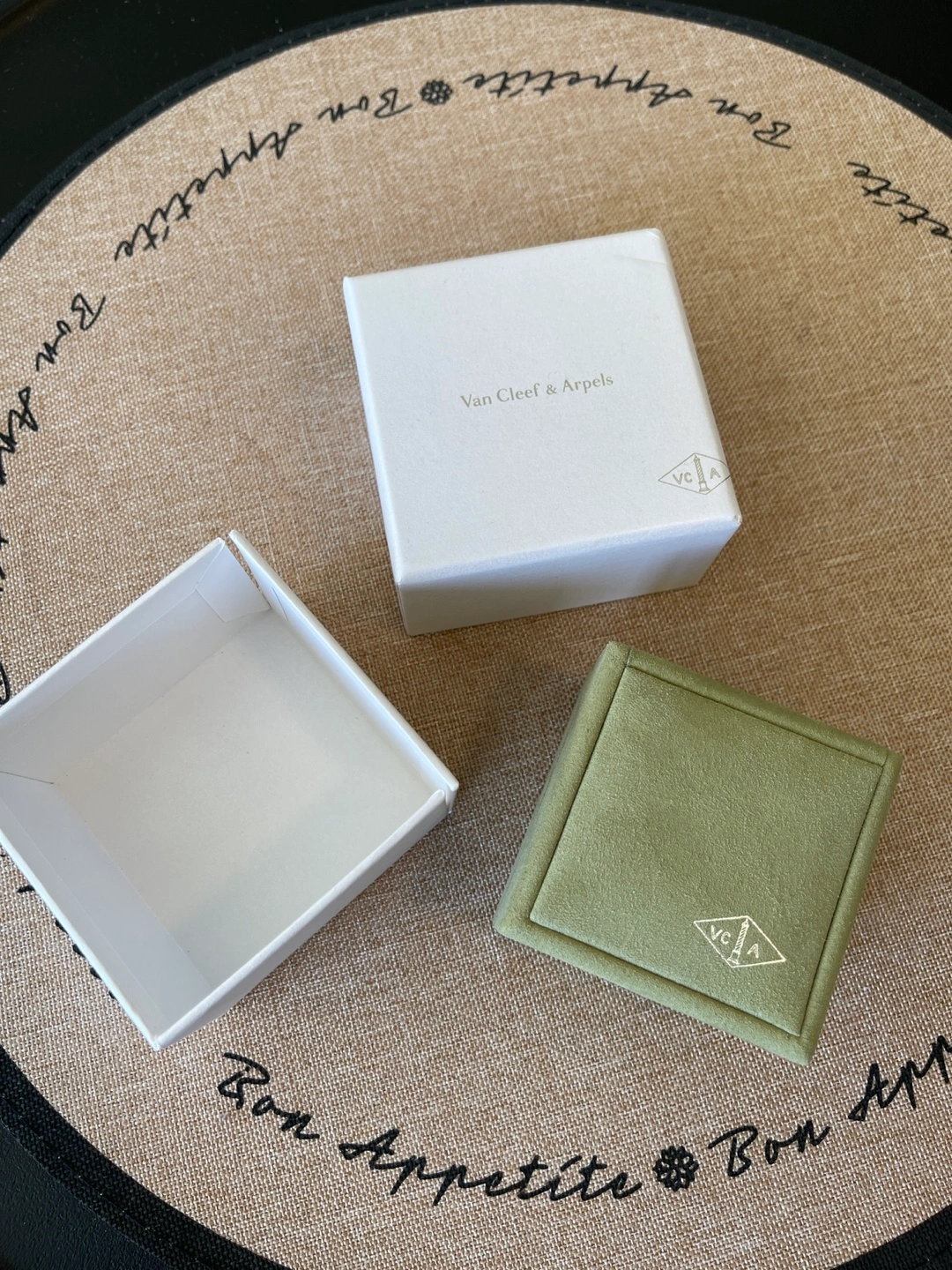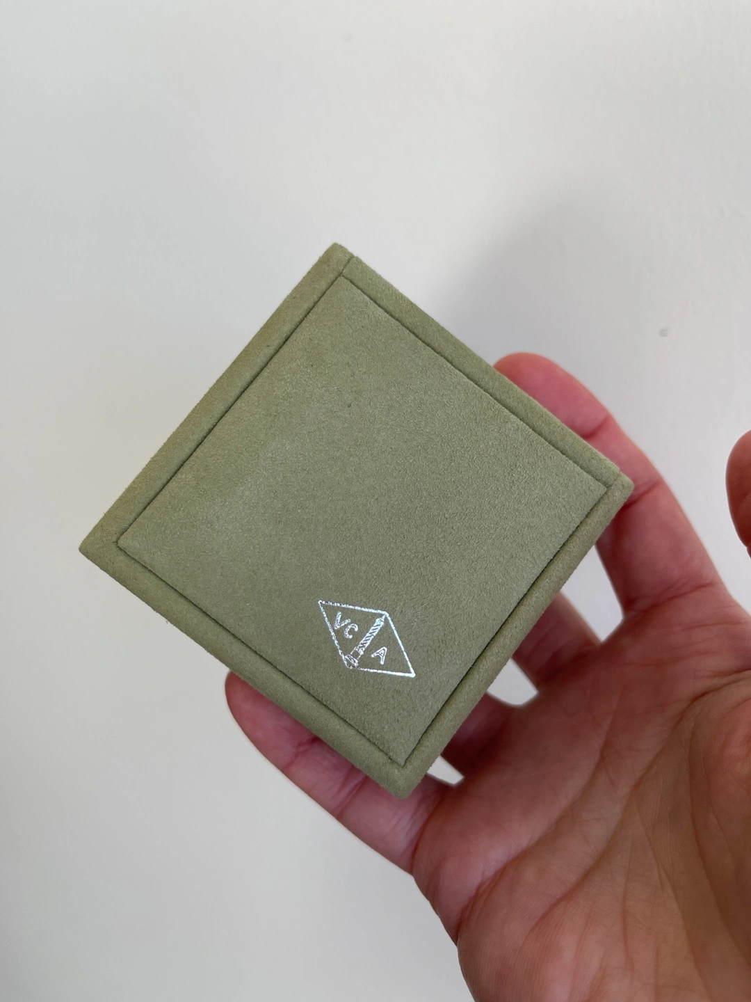 Luxury ring box. Pale green velvet exterior, black interior. Includes outer white box. Perfect for storing jewellery.