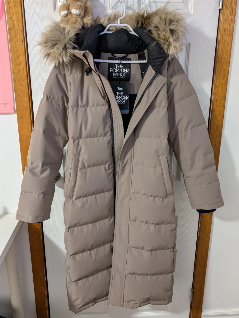 Long taupe puffer coat. Features a faux fur-trimmed hood. Excellent condition. Zip-up closure. $400 in store. Address: brimley & pitfield Porch pick-up and shipping available.