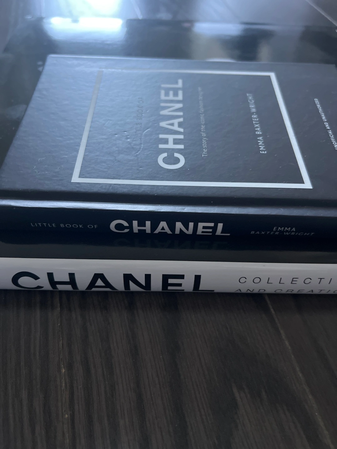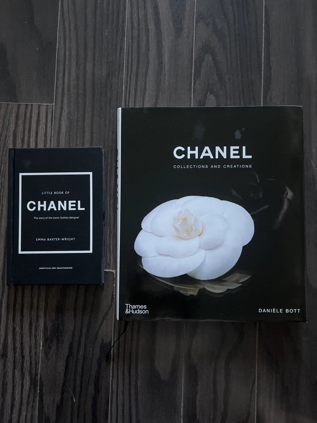 Two Chanel books. One is a smaller Little Book of Chanel, the story of the iconic fashion designer. The other is Chanel Collections and Creations, larger format. Both feature black covers with white text. Little book of Chanel $20 Chanel collections and creations $45 Take both for $55