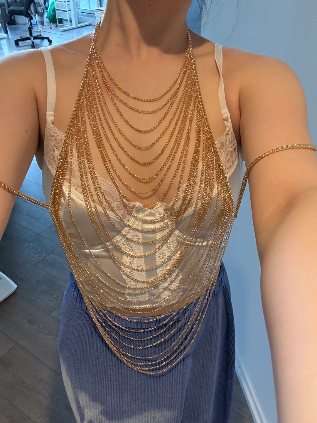 Long gold layered chain necklace. Can be worn as a body chain or necklace. Many thin chains. Gold coloured metal. Brand new with tag Buy three items from my listings and get one under 10 for free! Multiple purchases come with decent discounts!