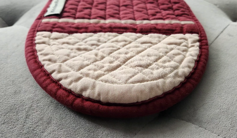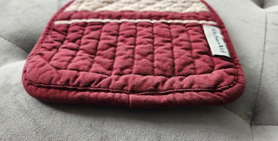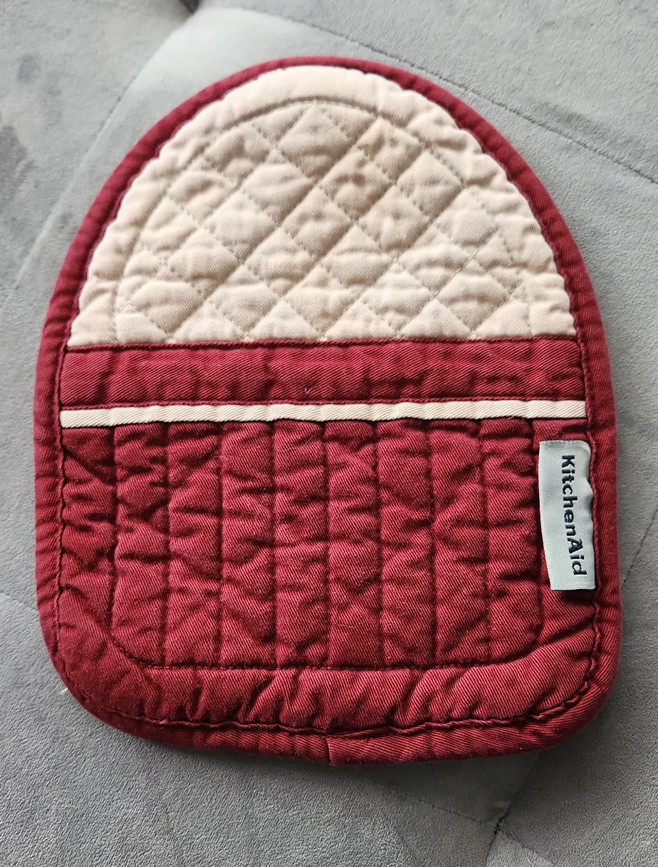 Kitchenaid red and beige quilted pot holder with metal ring for hanging. Heat resistant. Good condition. Slight wear.